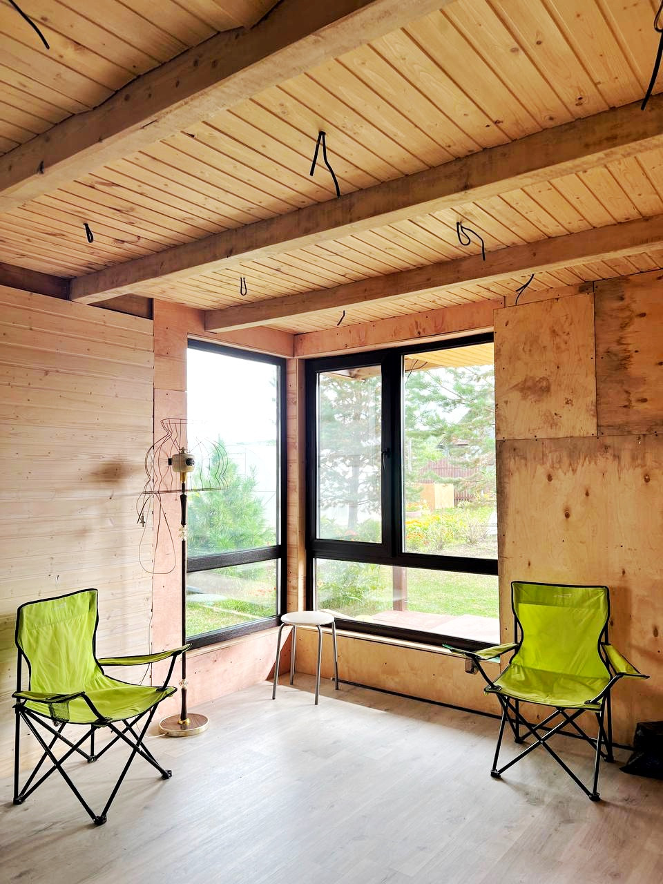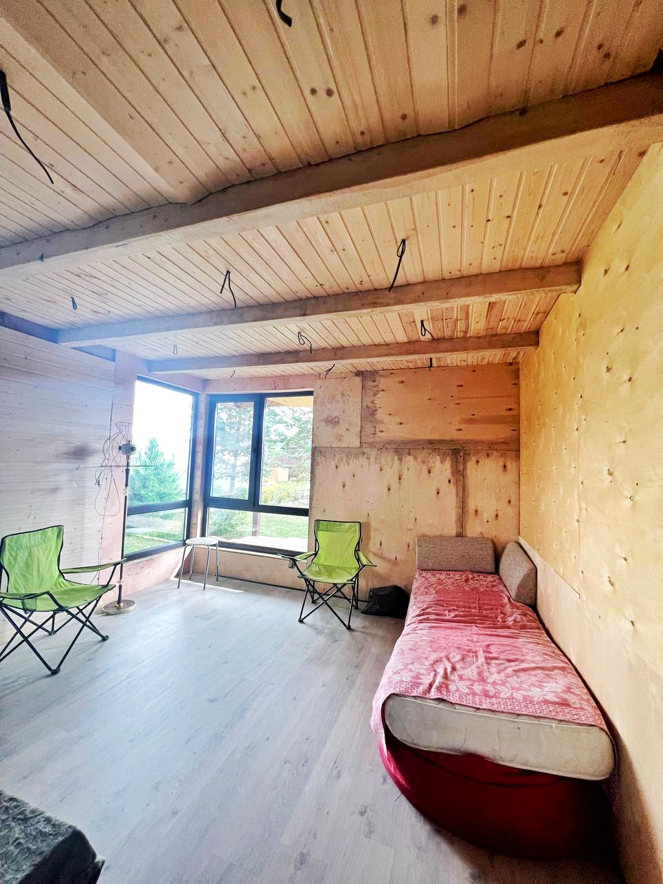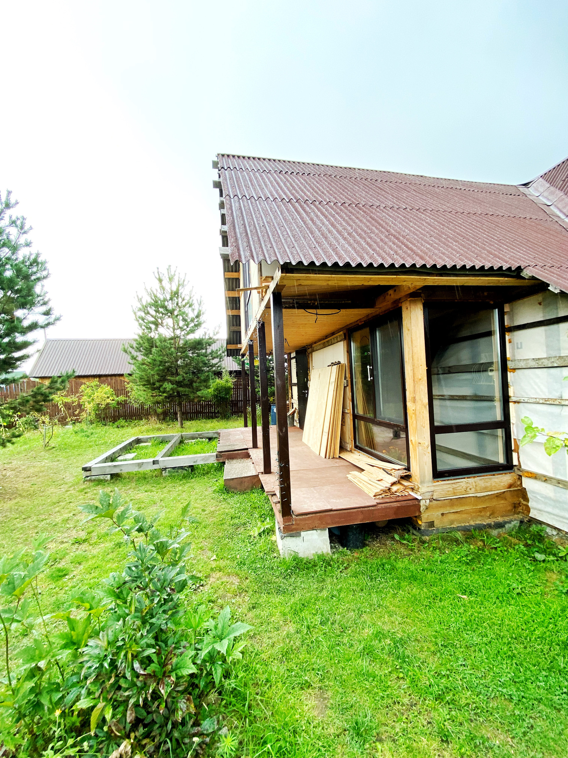 Дом (100 кв.м.), 4 комнаты, панорамные пластиковые окна в пол (ламинированные под дерево), обшит изнутри евровагонкой, частично фанерой (подготовлен для дальнейшей отделки), электрические радиаторы отопления, покрытие крыши - ондулин.