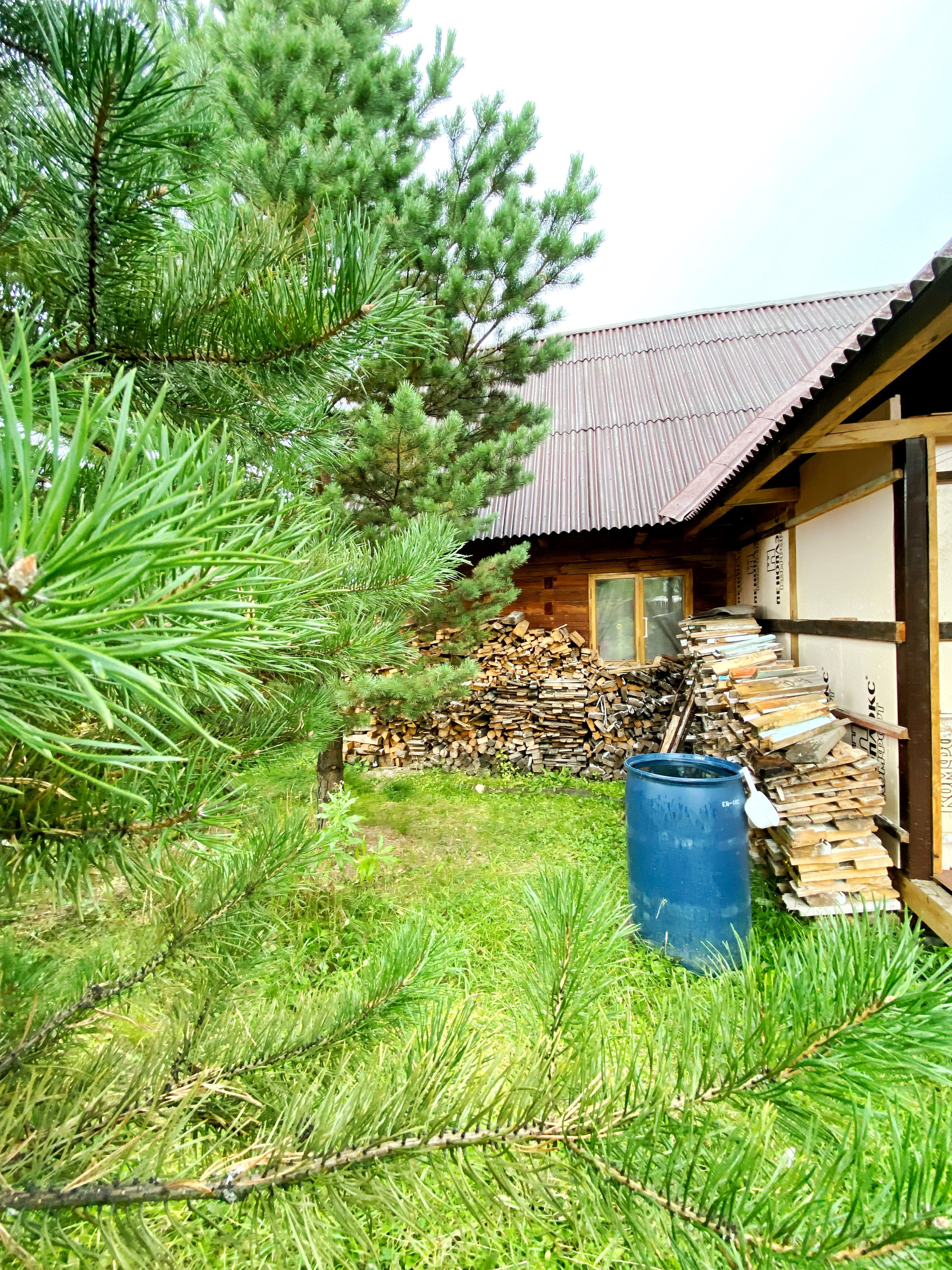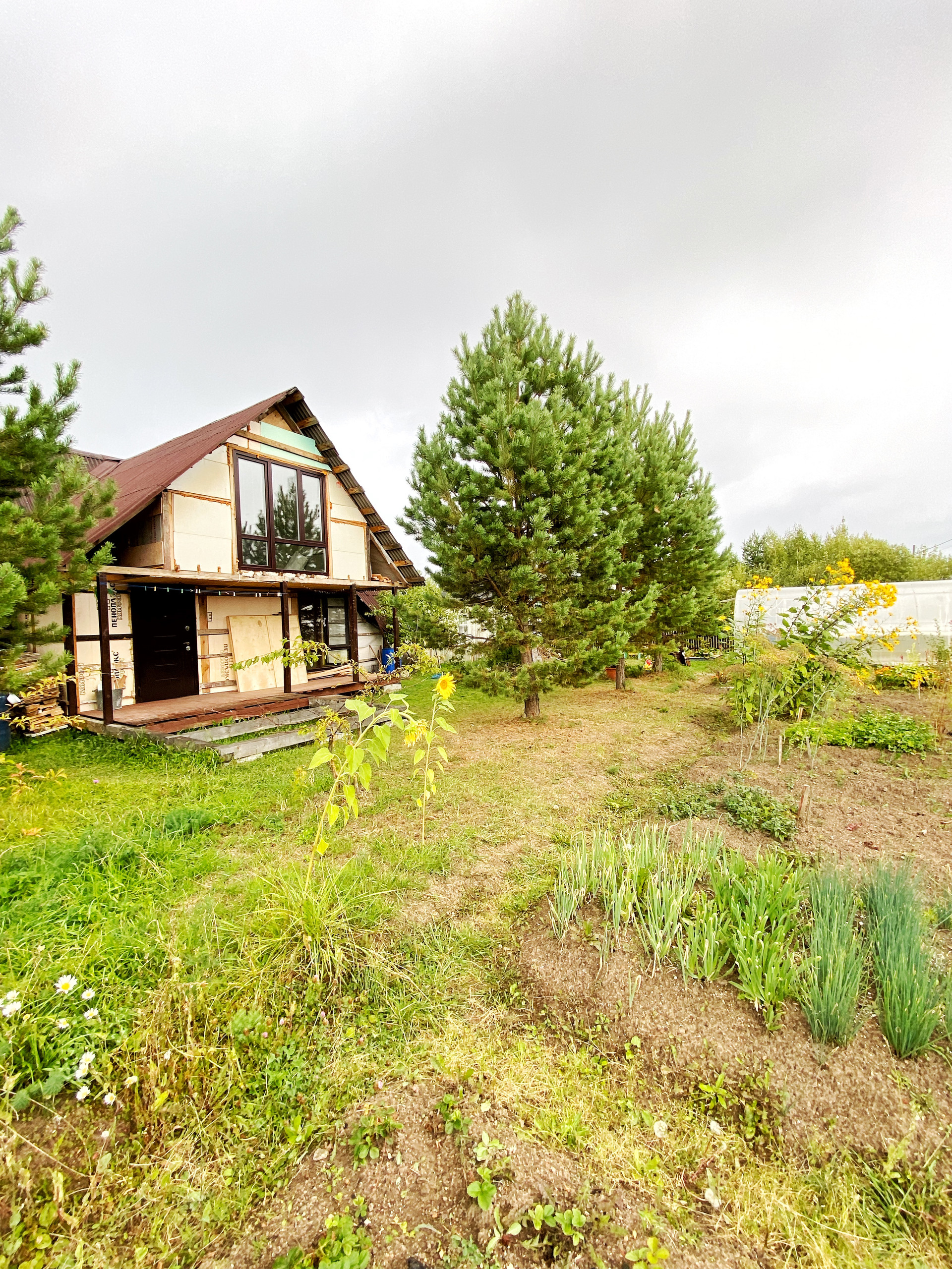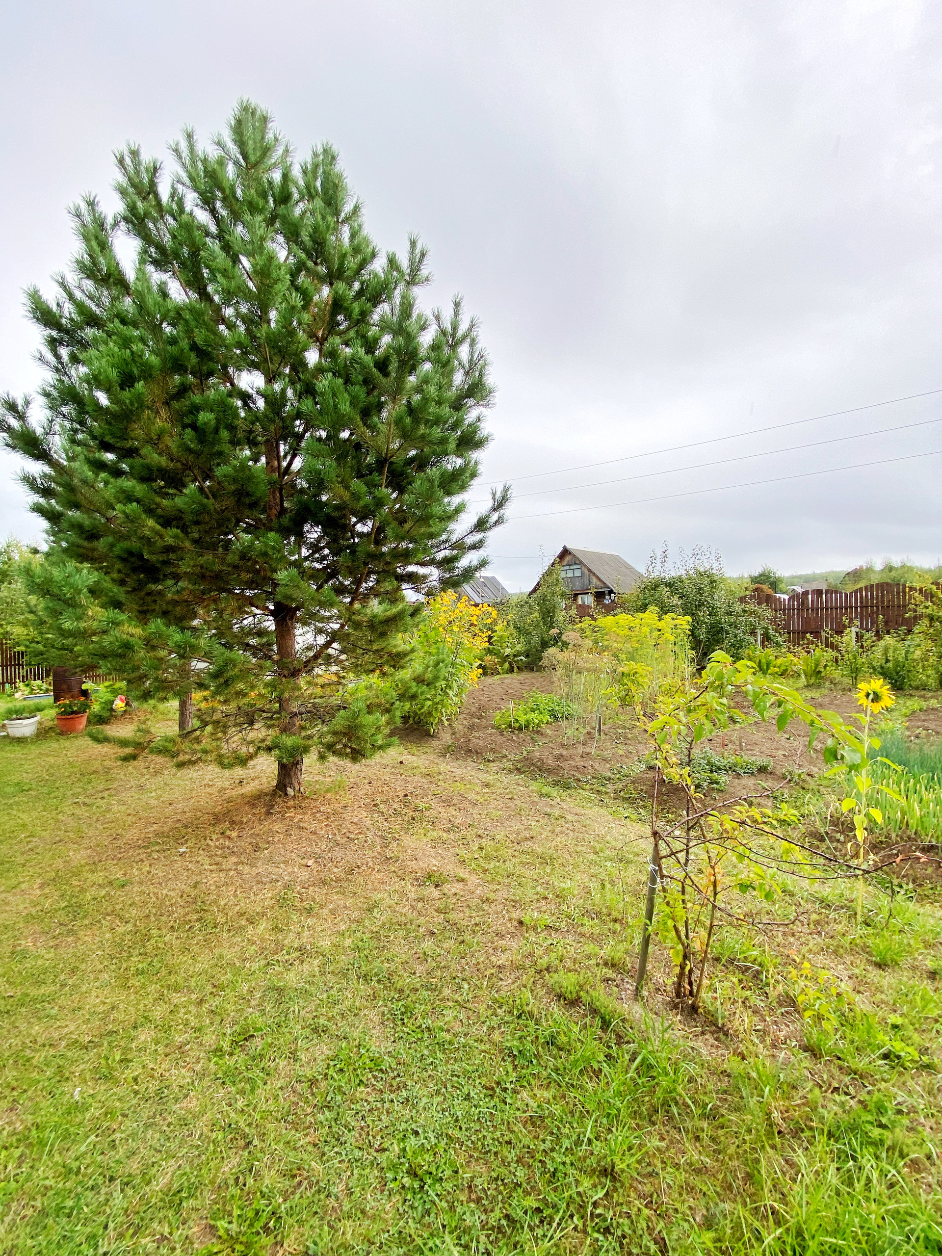 на участке сосны, кедр, плодово-ягодные, грядки