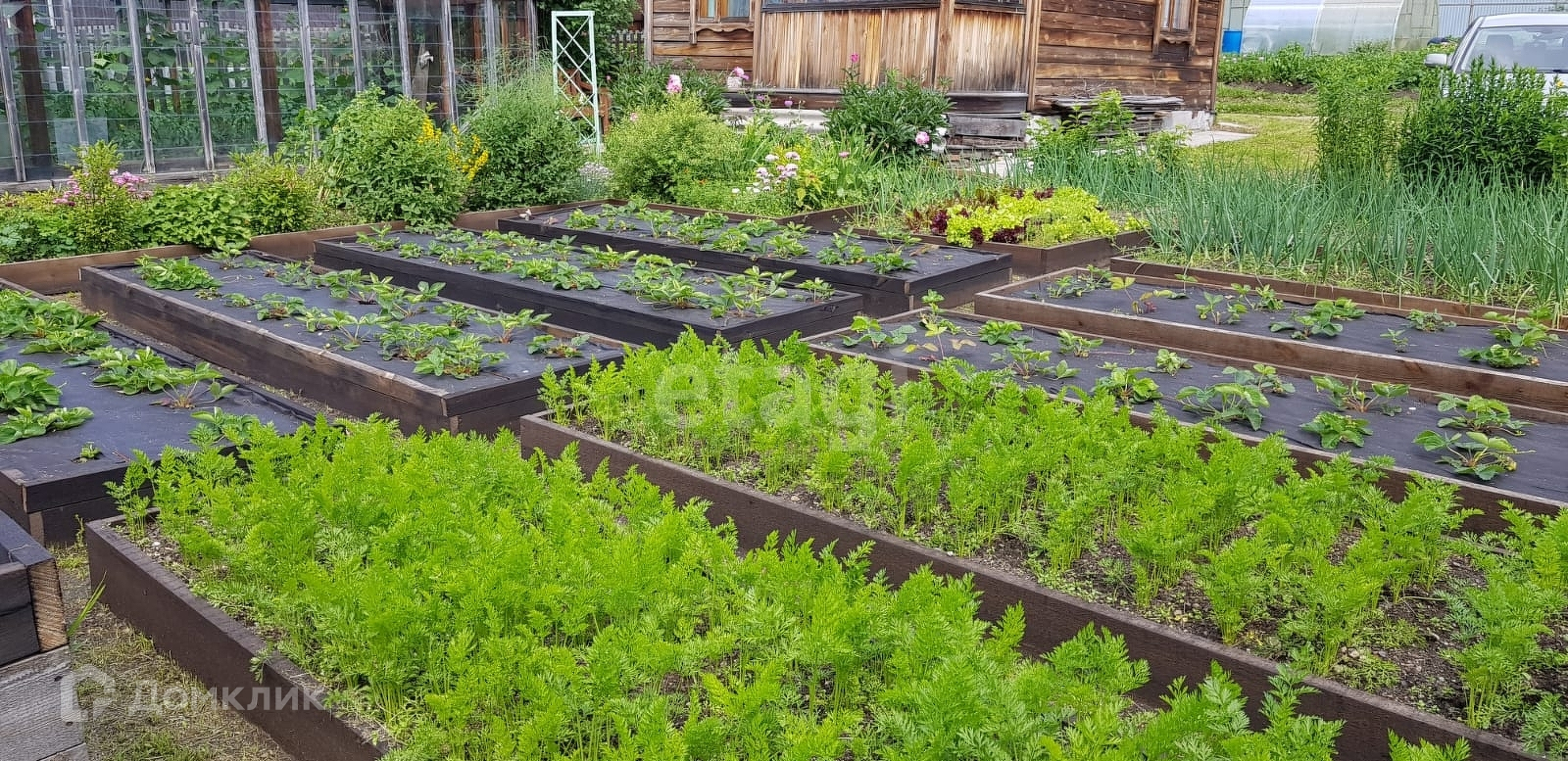 Также есть стеклянная теплица 9м×2.5м