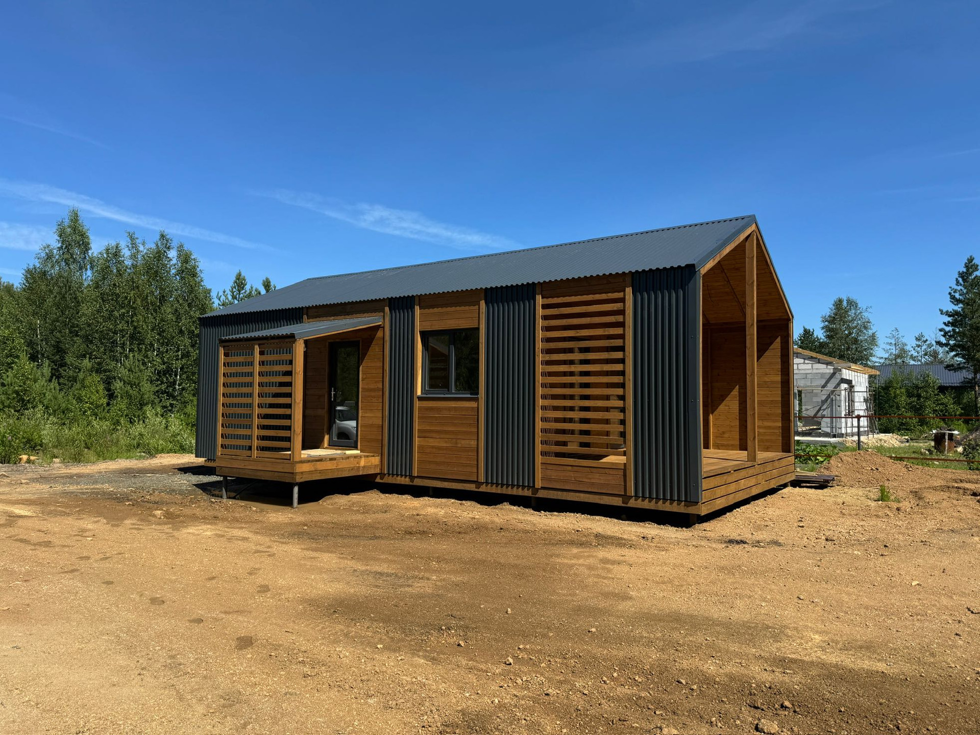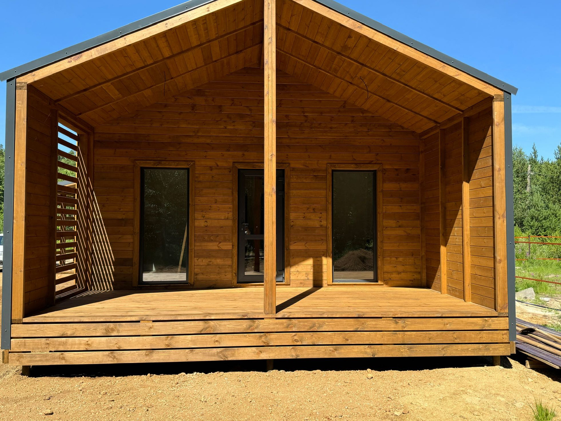 Продуманная планировка включает в себя две отдельные спальни, сан. узел, кухню-гостиную и террасу с видом на лес. Большая веранда в современной стиле, можно поставить кресла, гамаки для отдыха, столик.