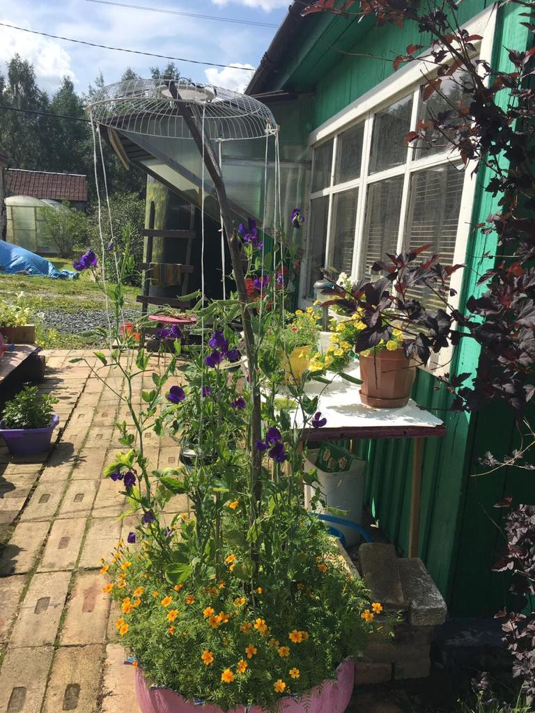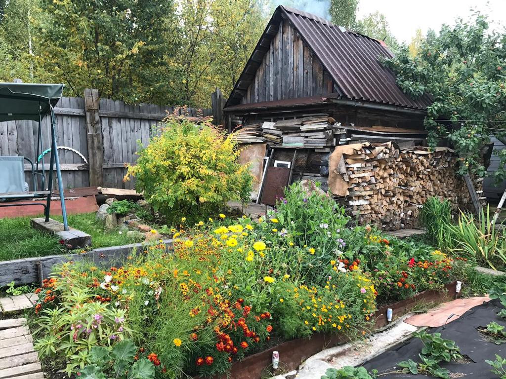 Участок прилегает к забору с выходом в лесной массив. Земля полностью разработана и удобрена, растет всё, многолетние насаждения (яблони, малина, смородина, слива), цветы. Дорожки между грядками, вымощенные доской, а у дома - кирпичом.