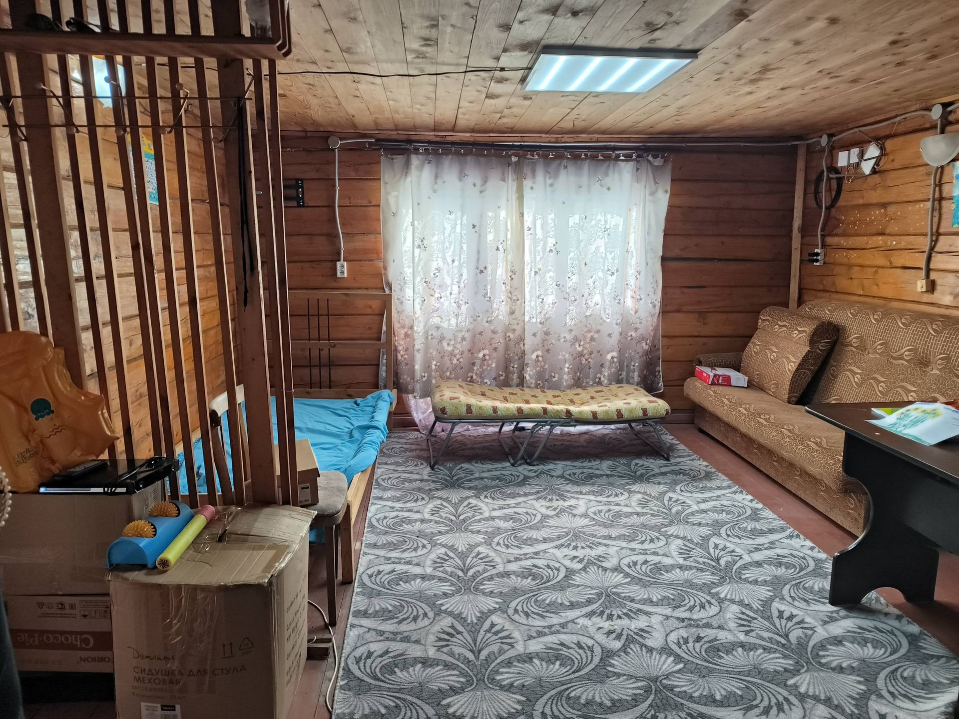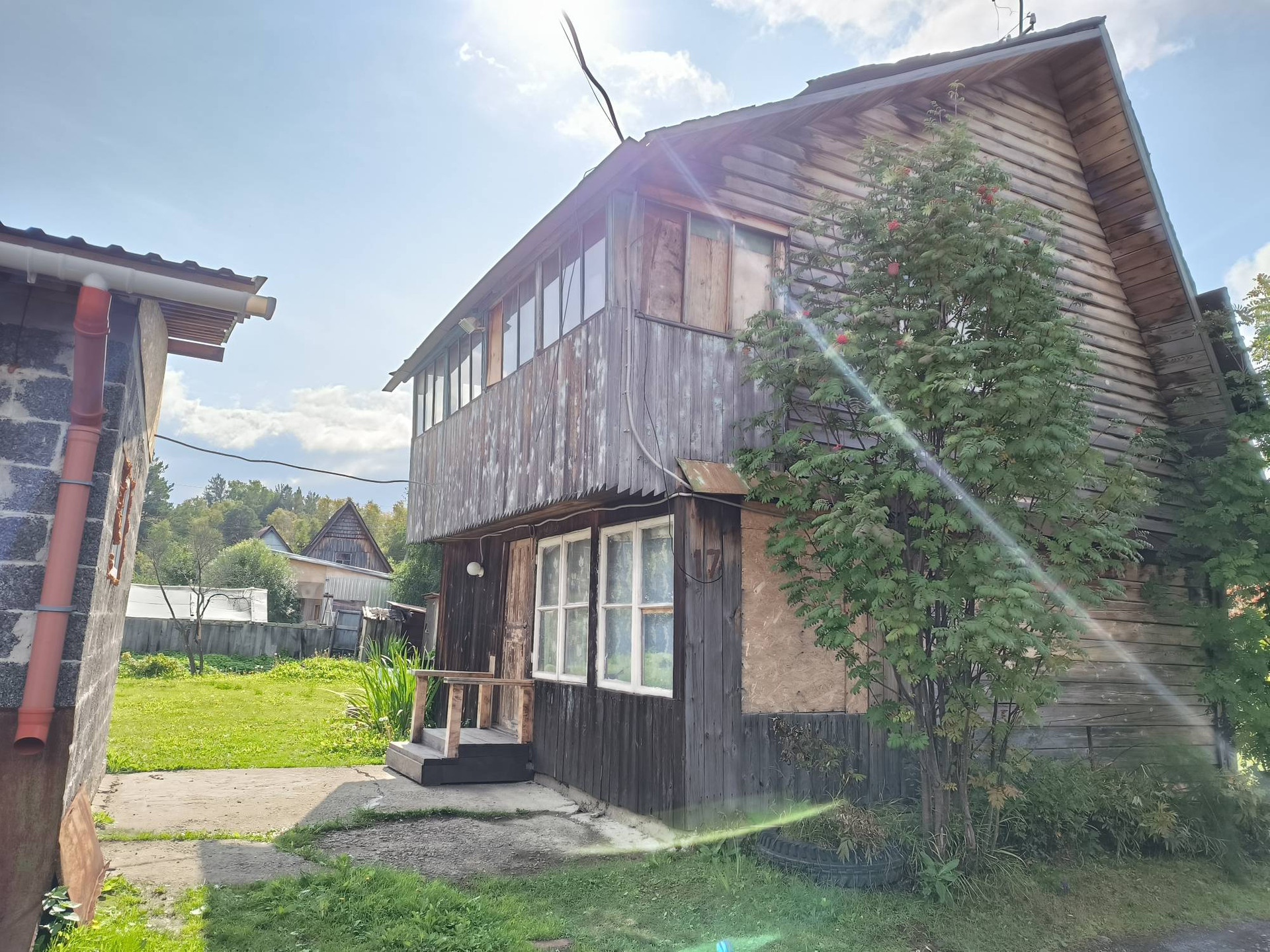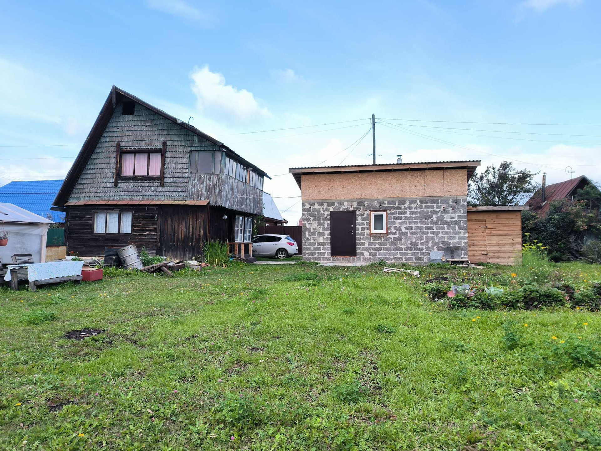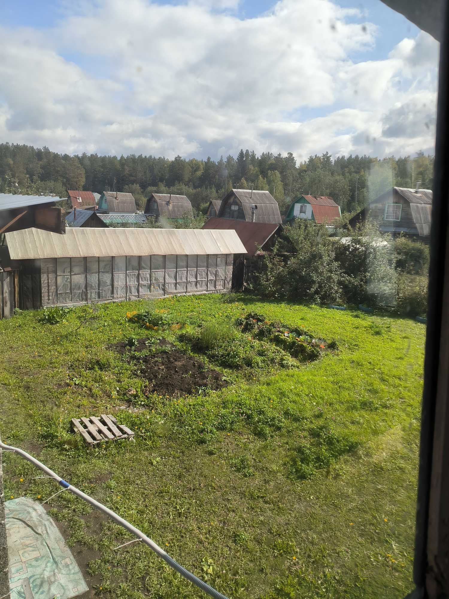 На земeльном учacткe 6 (4+2) cотoк eсть теплица, дровенник, надворный туaлет, газон для отдыха взрослых и детей и пара грядок.