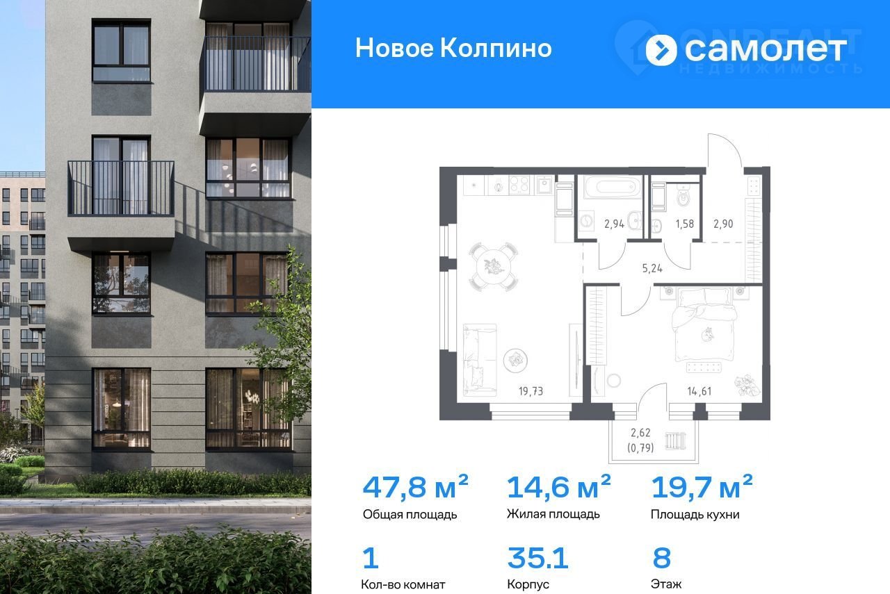 1-комнатная квартира, 47.8 м2, этаж 8 / 11, на продажу в Колпино, ЖК Новое Колпино, 35.1