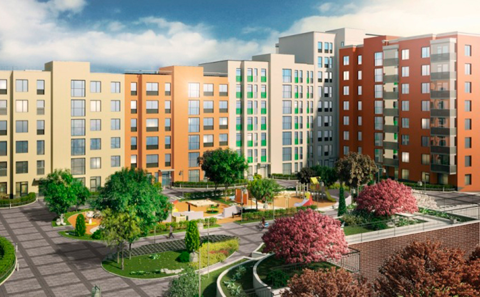 - На придомовой территории расположены пешеходные дорожки и тротуары, зеленые зоны с ландшафтным дизайном, места для отдыха, детские и спортивные площадки с безопасным резиновым покрытием.