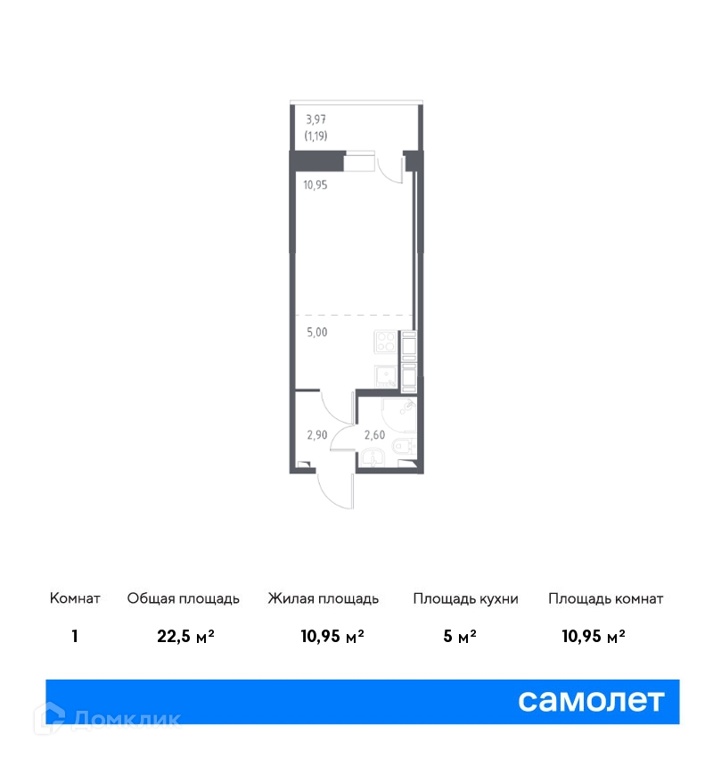 Общая площадь 22.5 м2