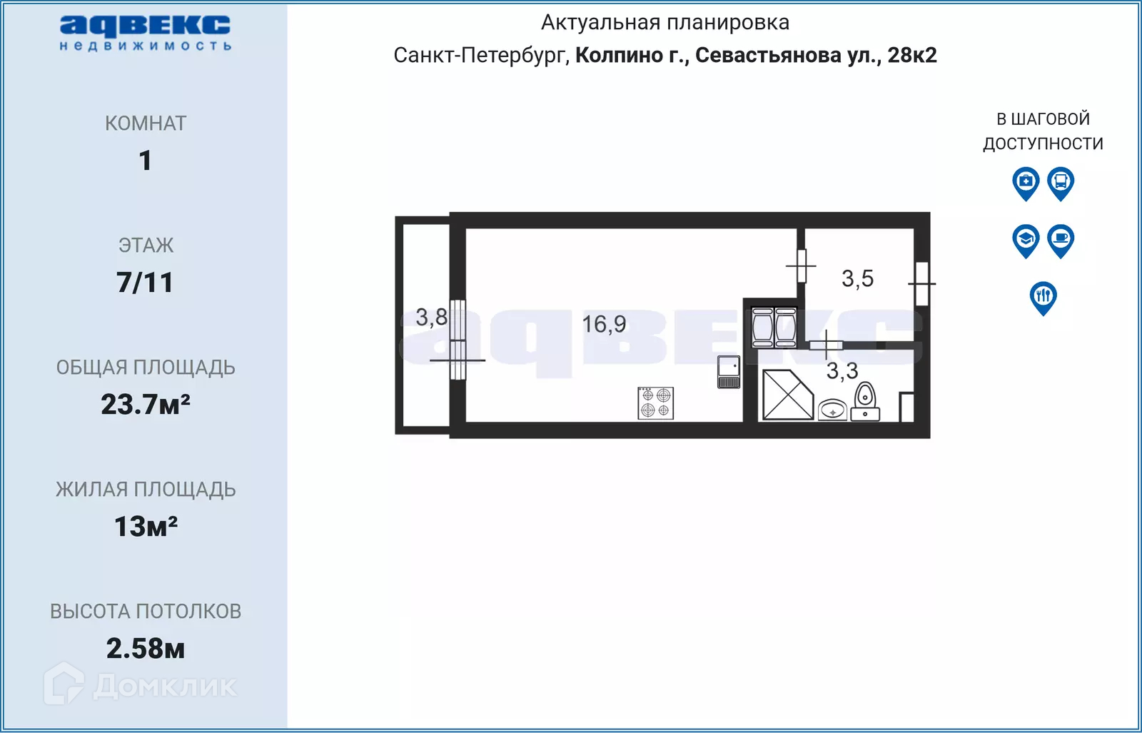 Квартира студия, 23.7 м2, этаж 7 / 11, на продажу в Колпино, улица Севастьянова, 28к2