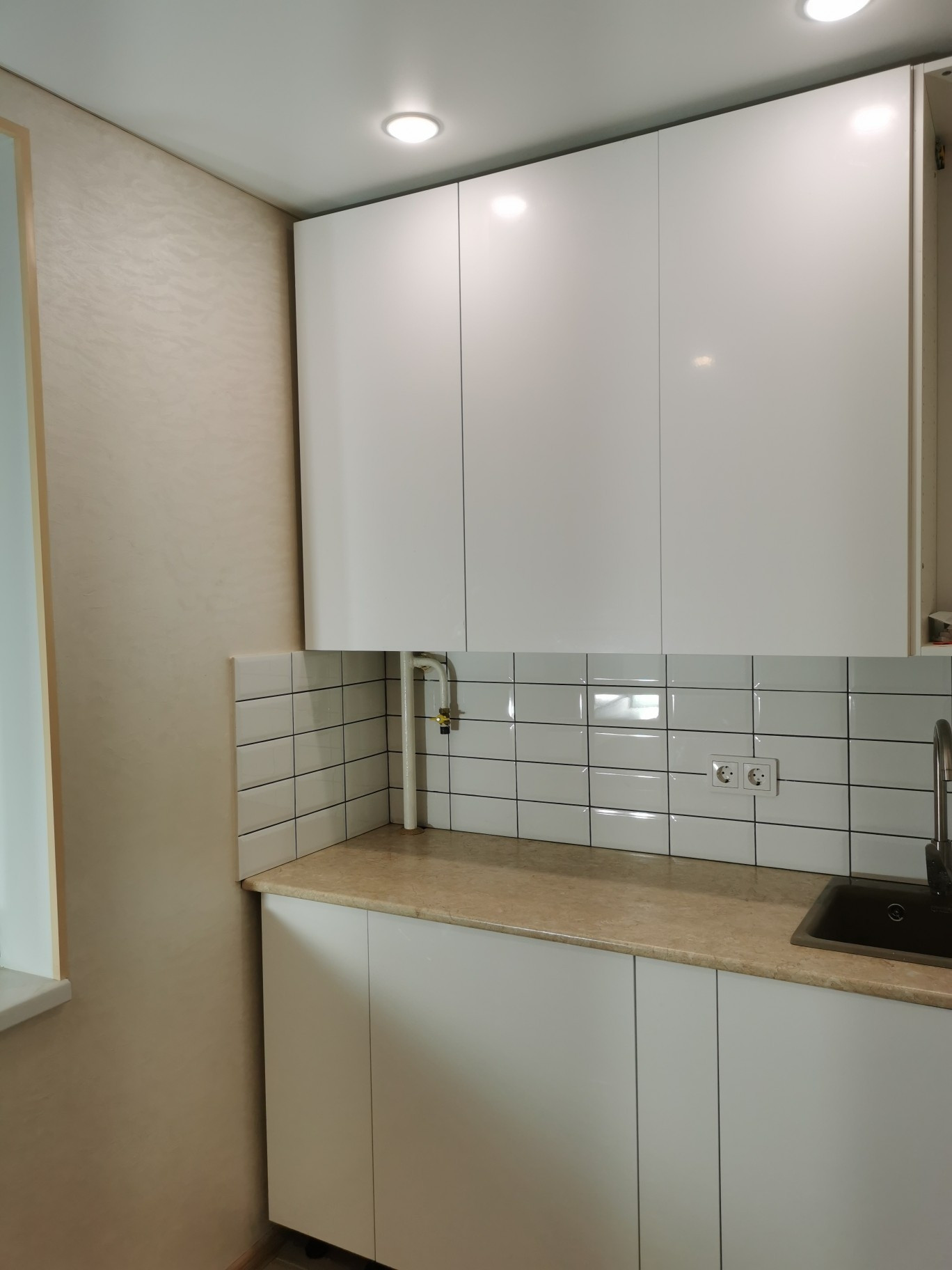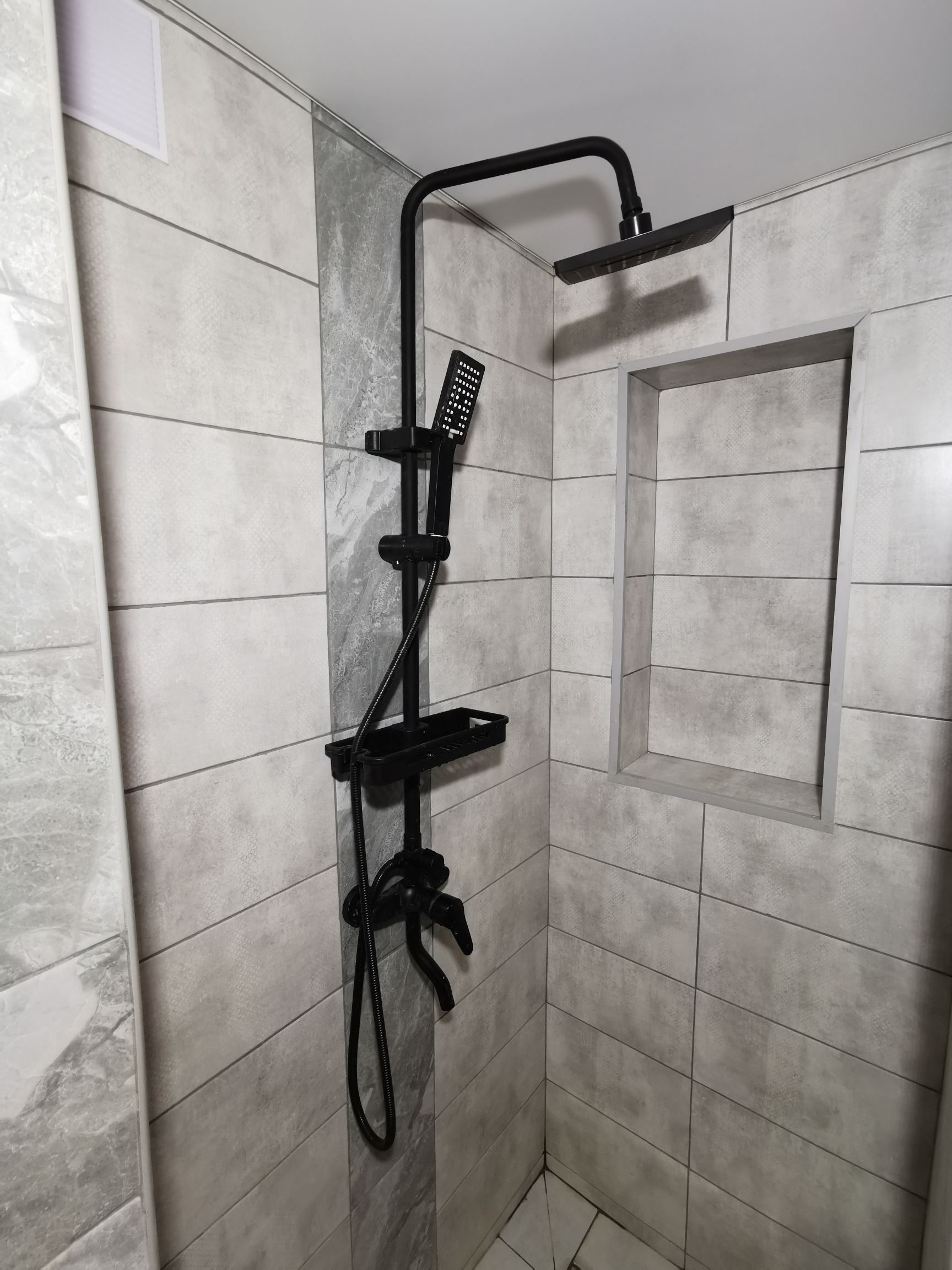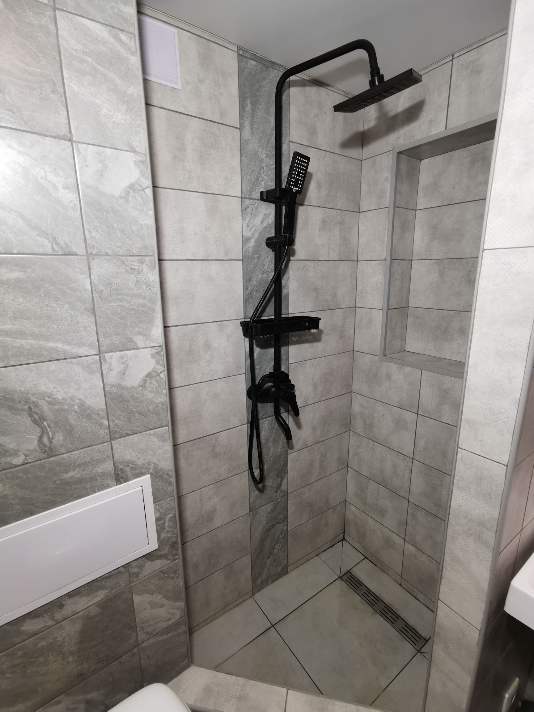 пол на кухне плитка, пол в коридоре плитка с подсветкой, в ванне сделана подводка для стиральной машины, душевая кабина с тропическим душем