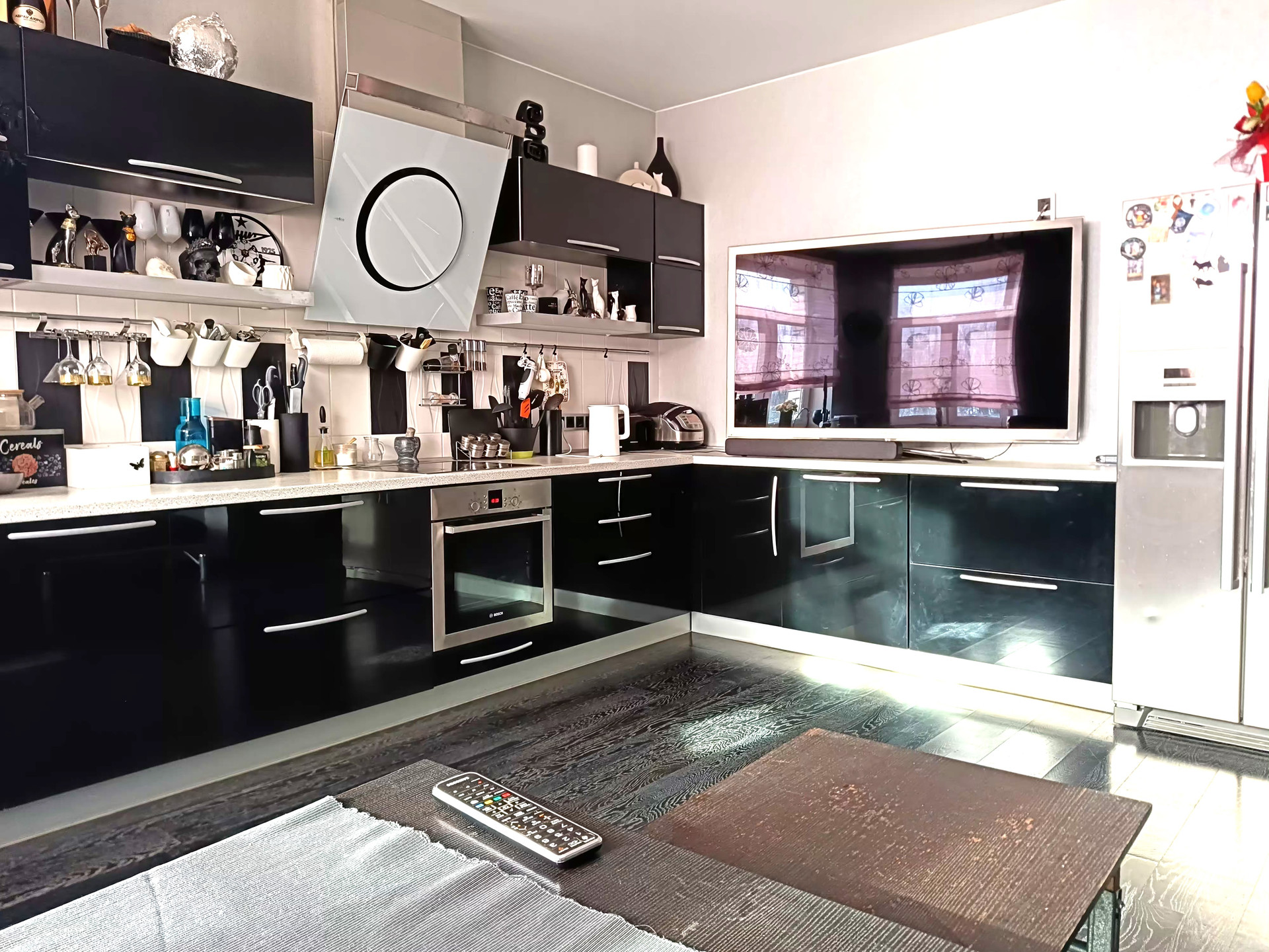 Встраиваемая техника  (духовой шкаф, варочная поверхность) и холодильник производства Bosch (Германия), вытяжка Elika (Италия)
