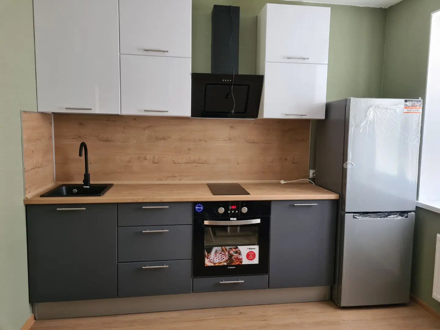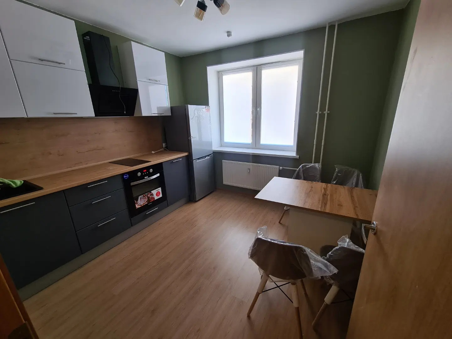 В квартире произведен ремонт, установлен кухонный гарнитур со всей необходимой техникой - варочной панелью, духовым шкафом. Есть холодильник, обеденный стол и стулья.