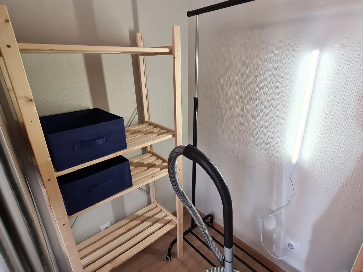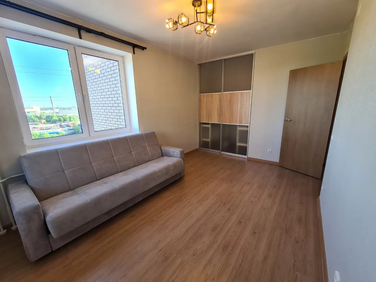 В комнате есть диван (раскладывается на 2 спальных места), встроенная система хранения. Комната очень светлая, балкон застекленный с панорамными окнами.