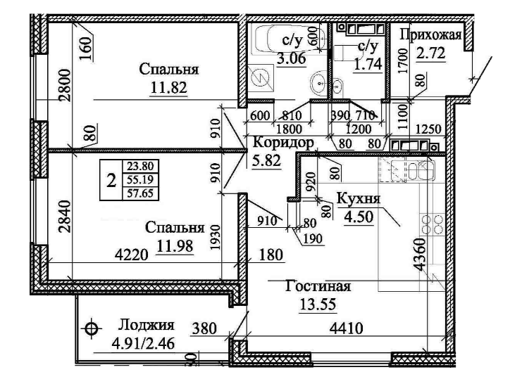 Общая площадь 55.19 м2
