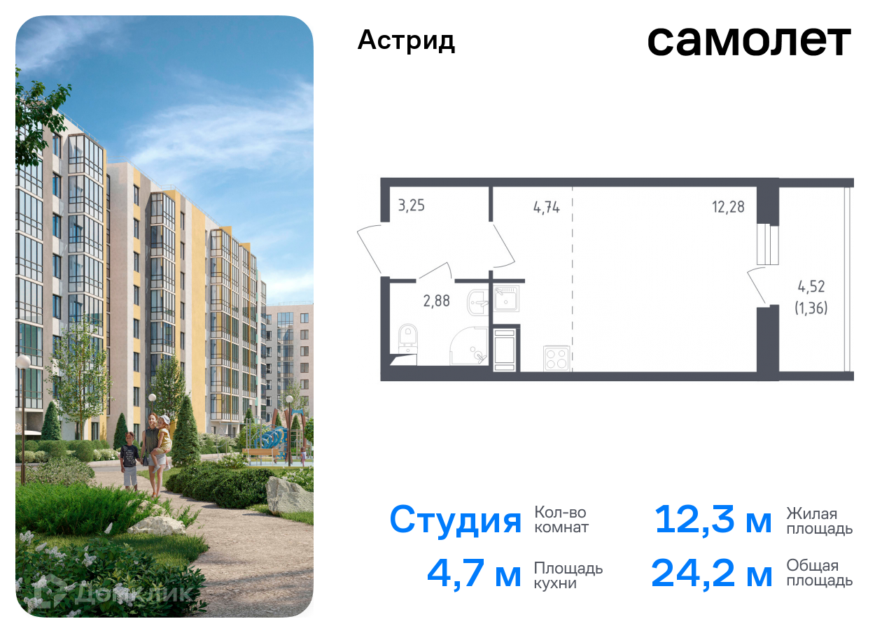Продается квартира-студия. Квартира расположена на 3 этаже 8 этажного монолитного дома (Корпус 10, Секция 4) в ЖК «Астрид» от группы «Самолет».