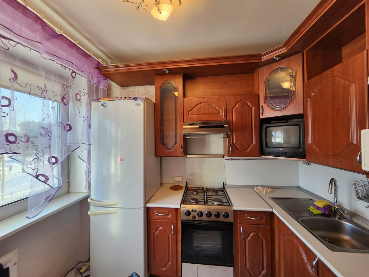 Квартира меблирована: кухонные модули, плита, холодильник, мойка, стол и стулья; в комнате: раскладной диван, стенка, телевизор. Вторая комната диван,шкаф. В прихожей шкаф,вешалка для одежды и т.д. Стиральная машина. Лоджия большая.