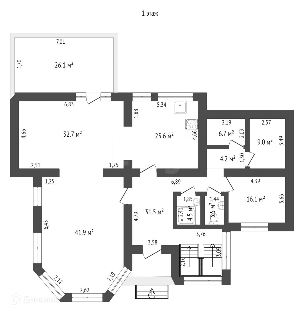 Высота потолков 1 этажа - 3,3 м, 2 этажа - 2,9 м.