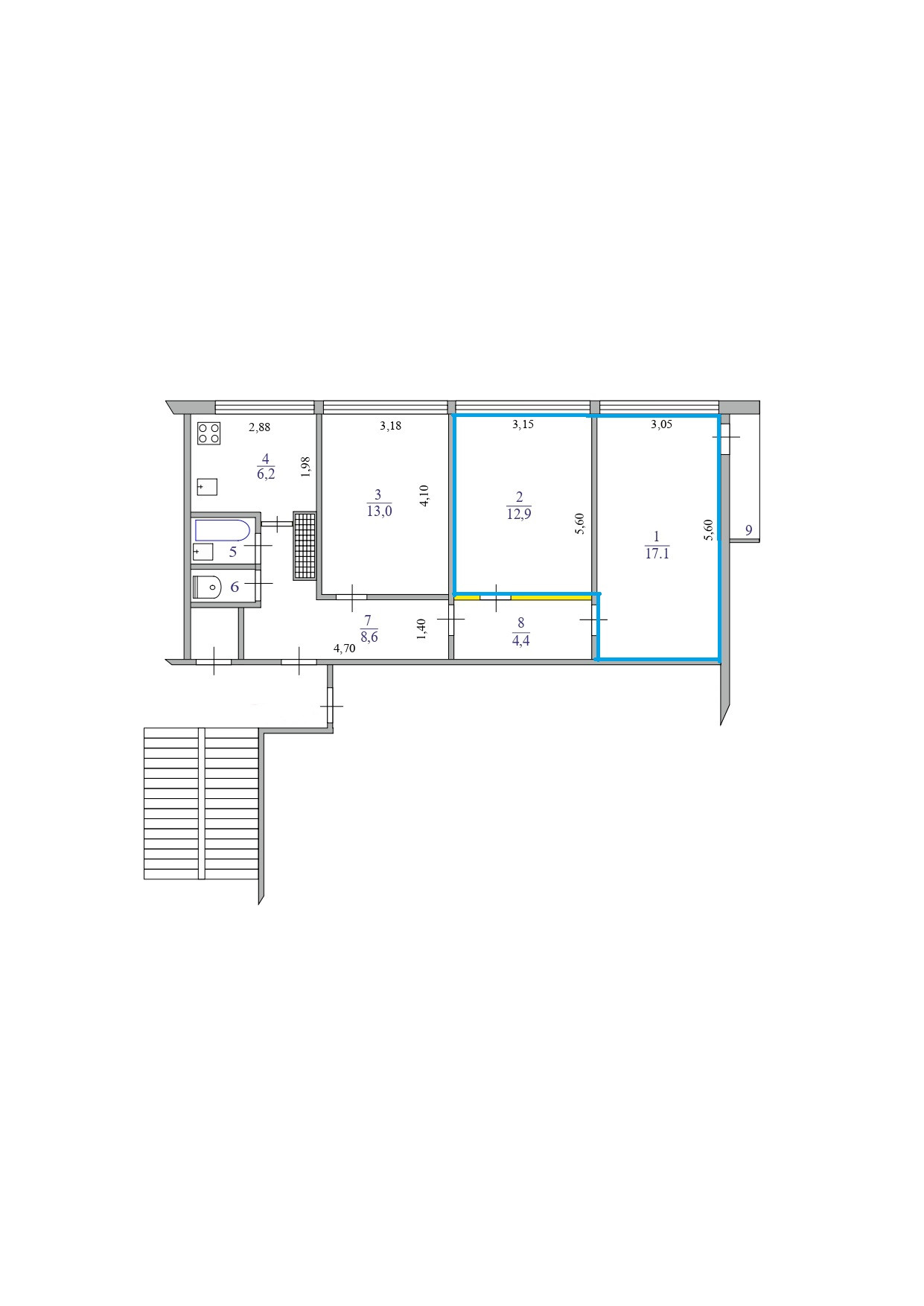 В продаже две комнаты (17,1кв.м. с лоджией и 12,9 кв.м.) в 3-х комнатной квартире с возможностью выкупа третьей комнаты(никто не живет).   Комнаты отделены отдельным тамбуром от общего коридора.