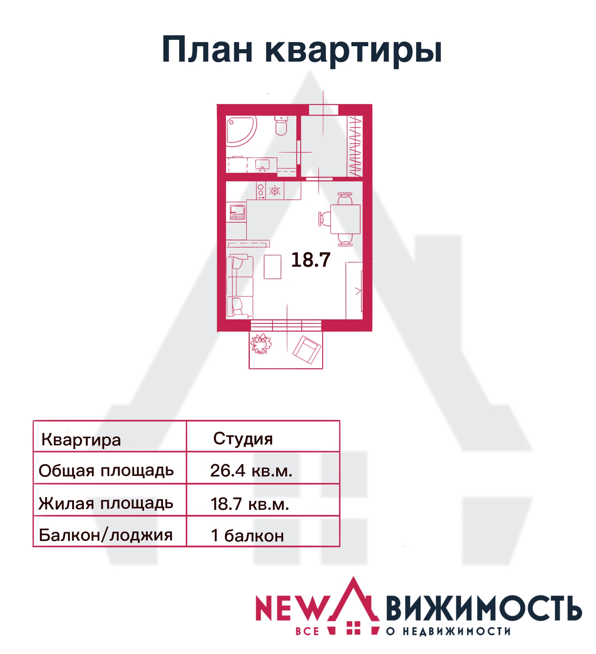 Общая площадь 26.4 м2