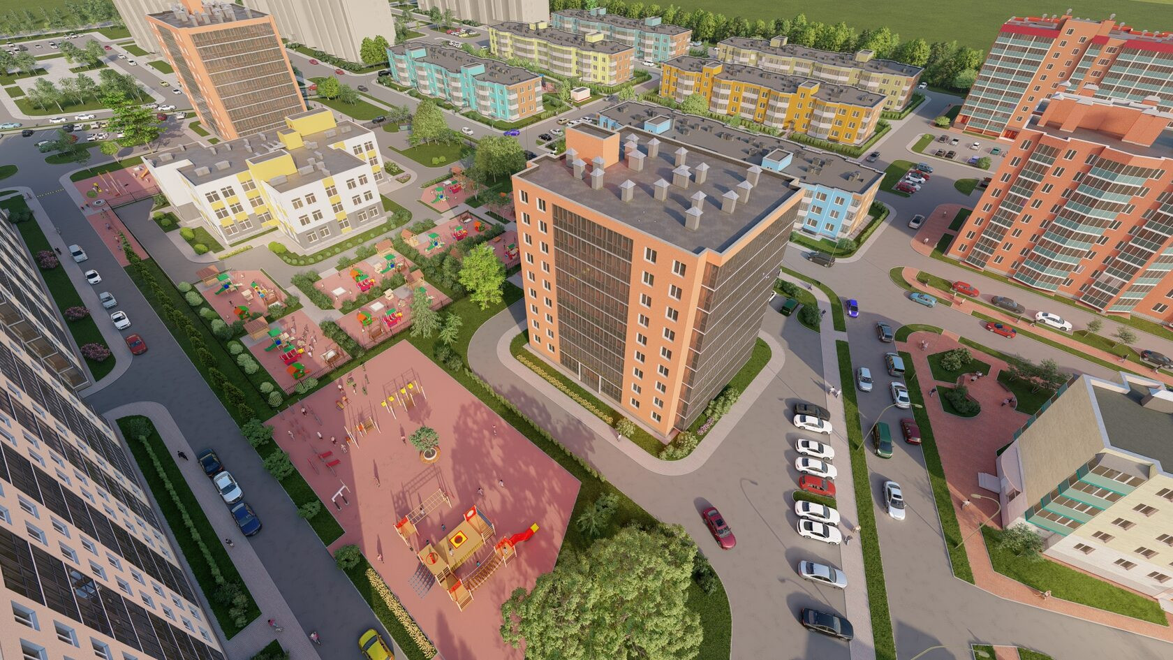 - Для автовладельцев предусмотрено 92 наземных парковочных места у каждого дома.