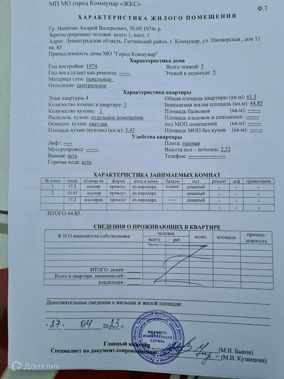 Жилая площадь 44.85 м2