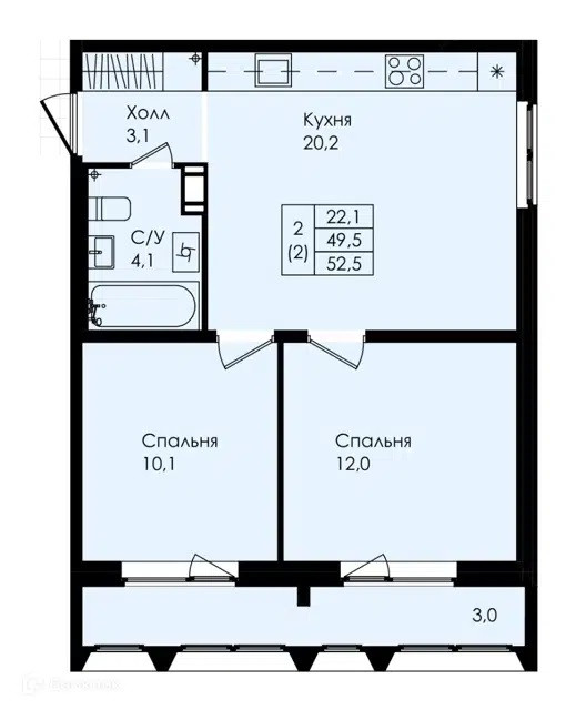 Общая площадь 52.5 м2