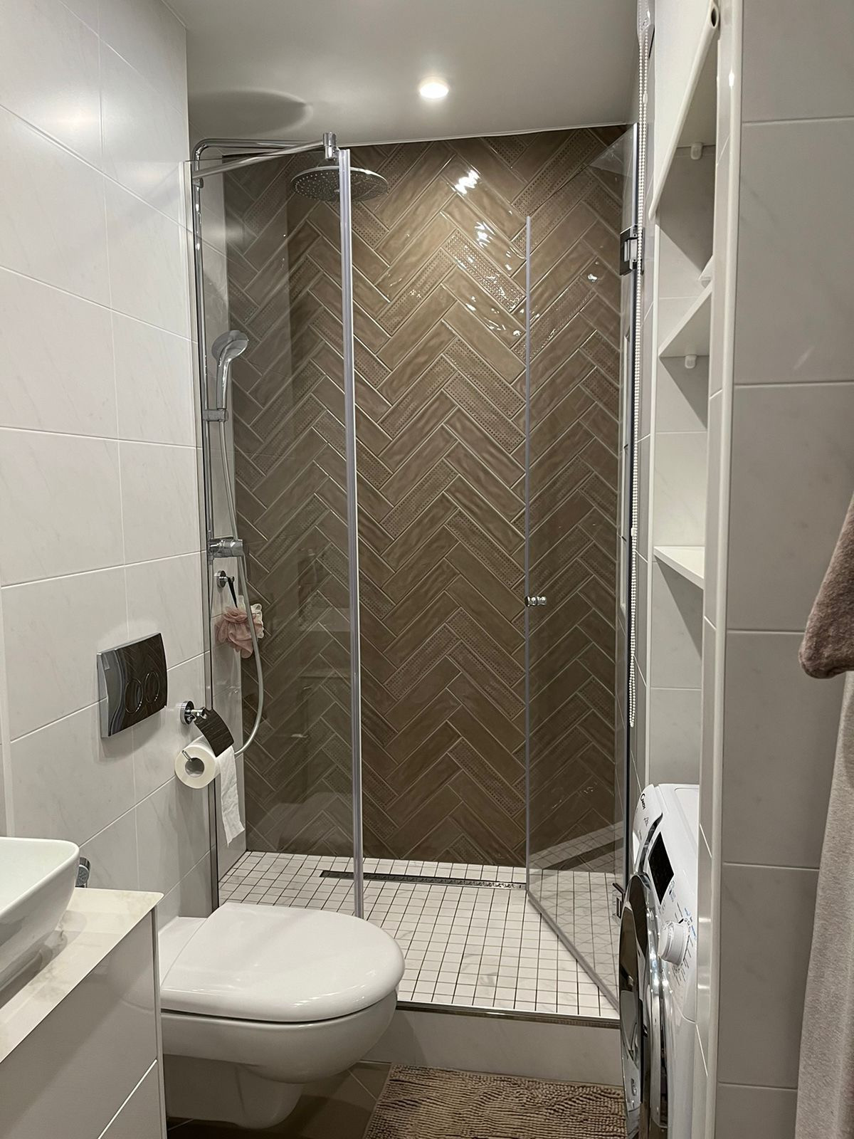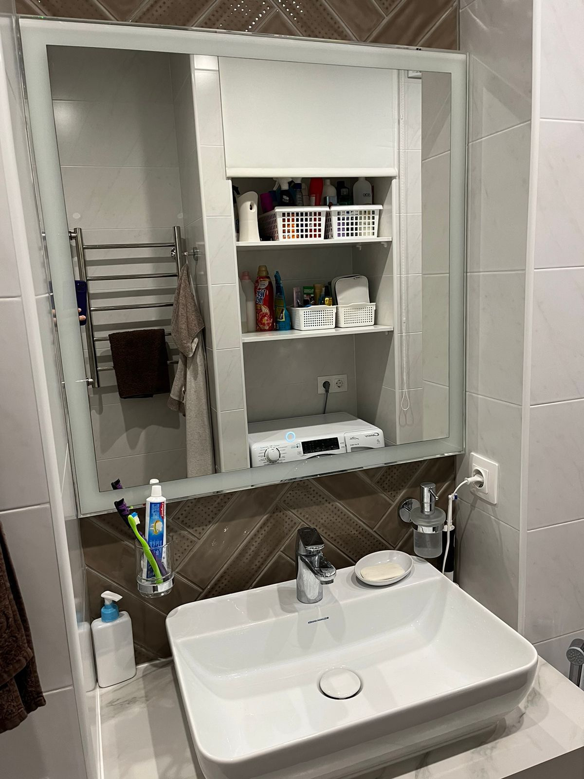 В ванной остается стиральная машинка с функцией сушки (Candy), а так же есть ниша для хранения стиральных порошков.