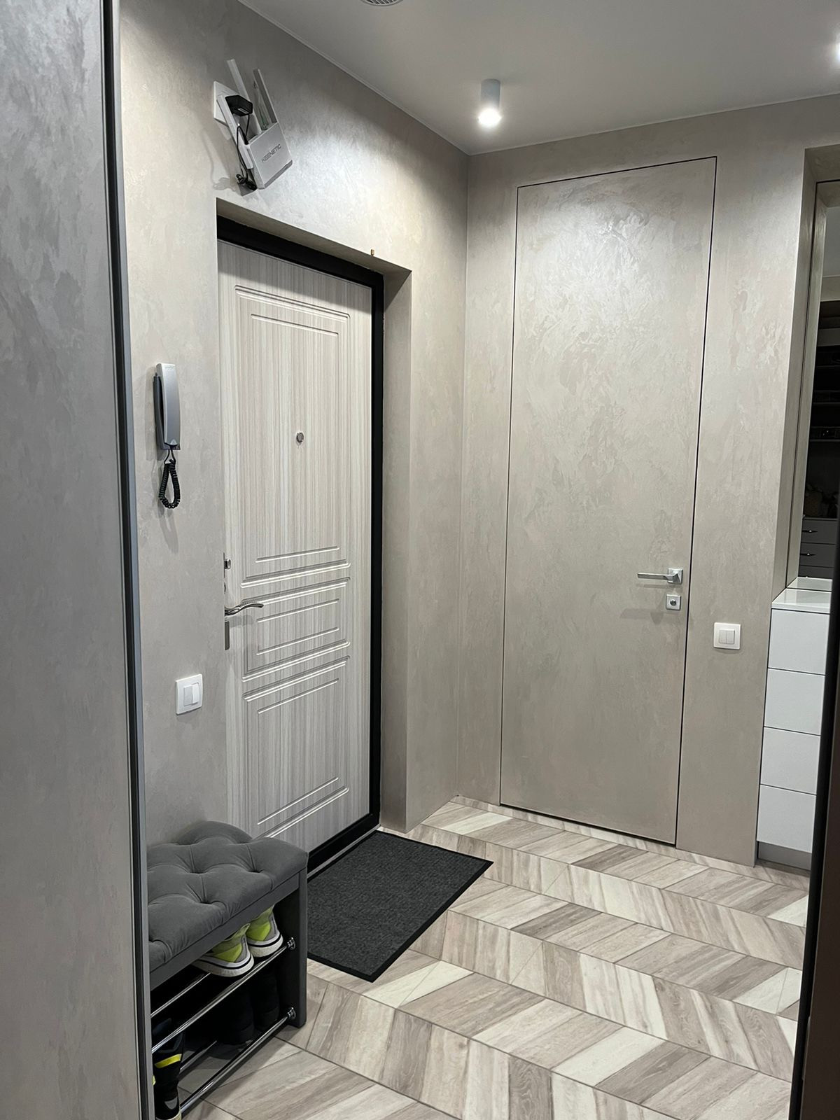 В прихожей установлен встраиваемый шкаф под верхнюю одежду, который был изготовлен под заказ.