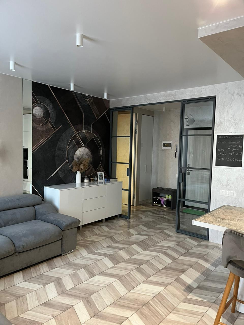 Зона кухни и прихожей огорожена раздвижными дверями из стали с напылением, которые делались под заказ.