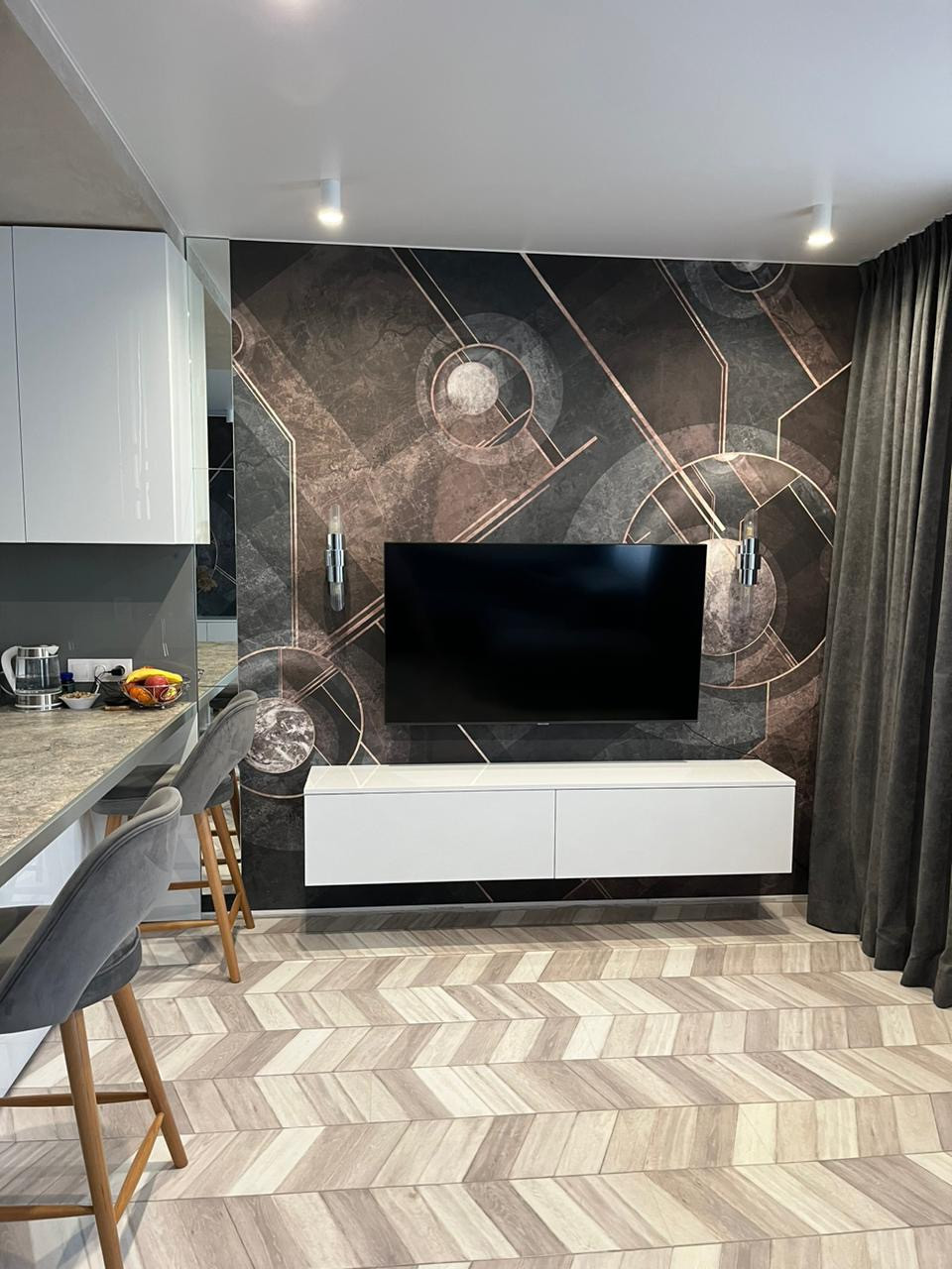 Стены покрыты декоративной штукатуркой с обоями под заказ.