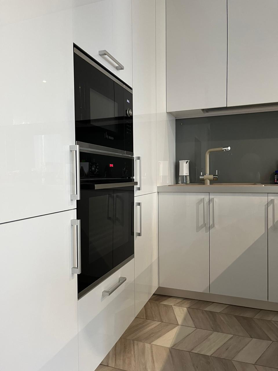 Вместительная кухня -гостиная (25 м²) с кухней под заказ и встраиваемой техникой. Рабочее пространство оборудовано всеми необходимыми аксессуарами и техникой: фильтры для питьевой воды, кухонный смеситель - двухрычажный с подачей воды для питья, итальянской фирмы Florentine. Встроенная индукционная варочная поверхность, микроволновая печь и посудомоечная машина фирмы Bosch. Холодильник фирмы Haier и вытяжка фирмы Kuppersberg.