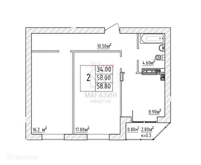 Общая площадь 58.8 м2