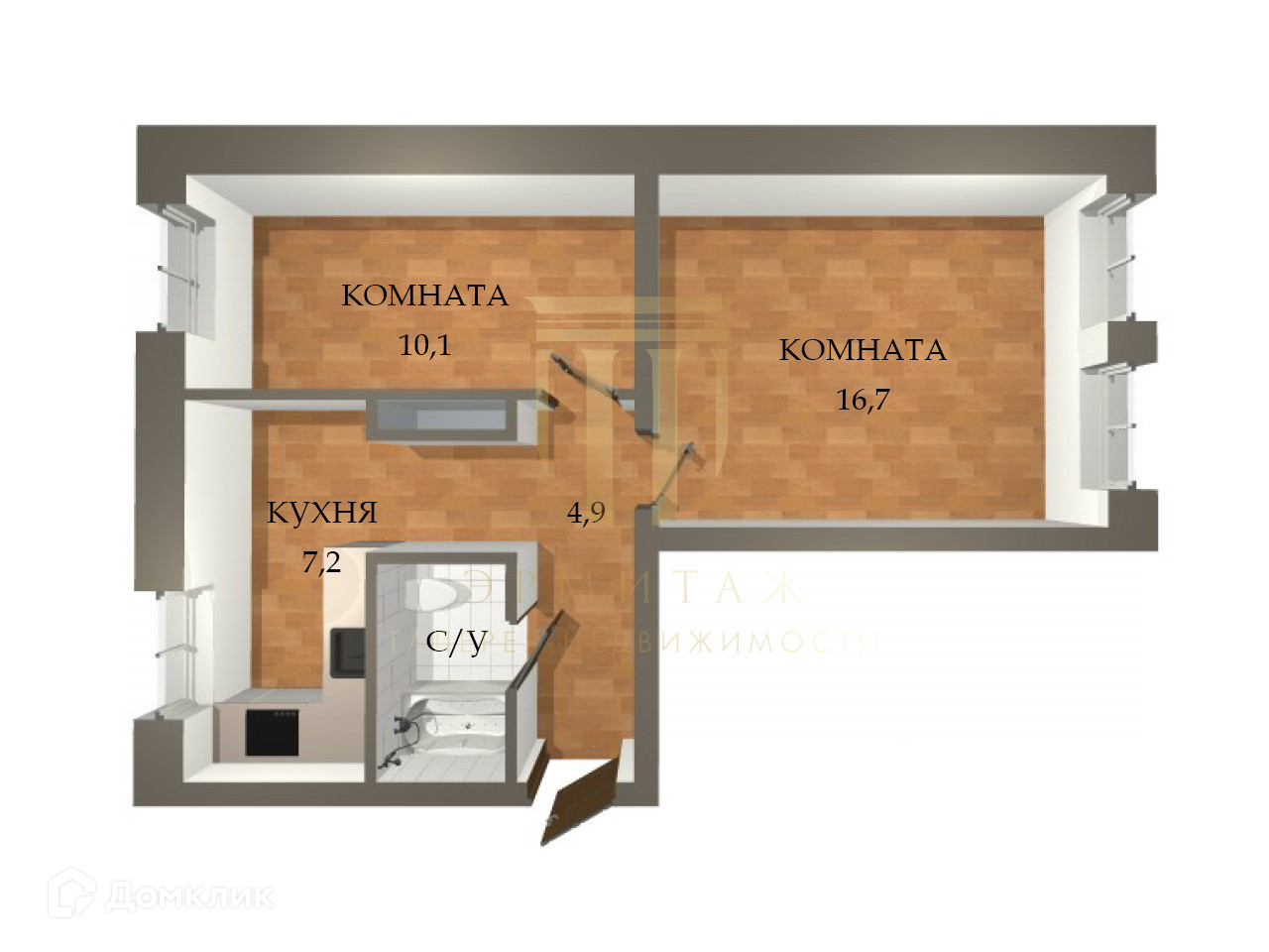 Общая площадь 43.6 кв.м., изолированные комнаты 10 и 16.7 кв.м., кухня 7.2 кв.м.