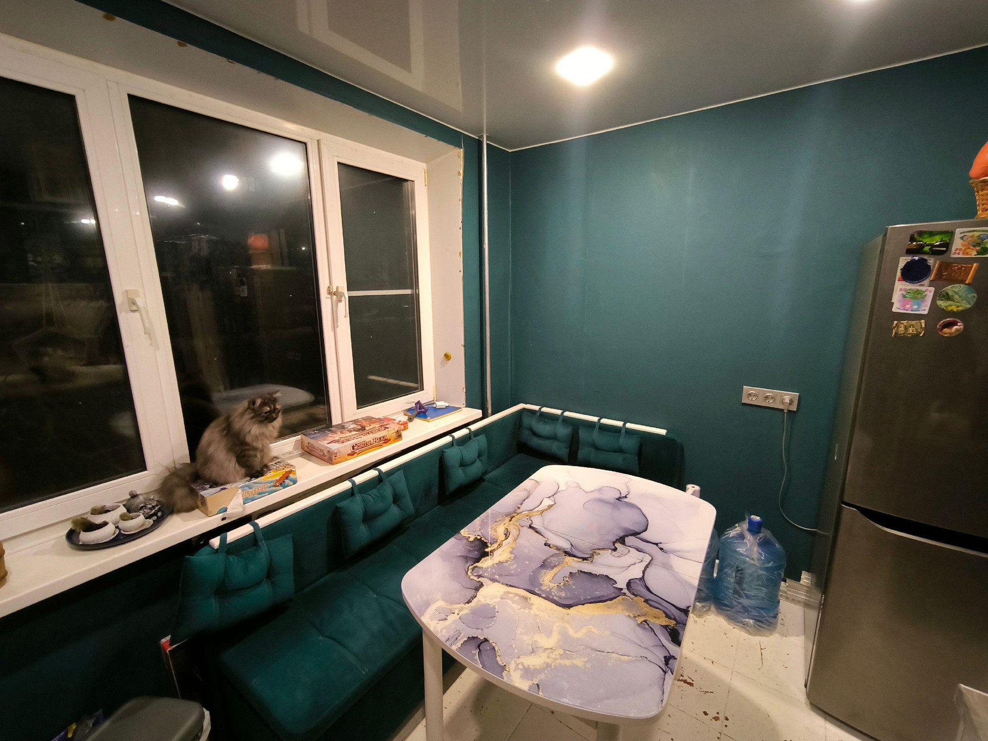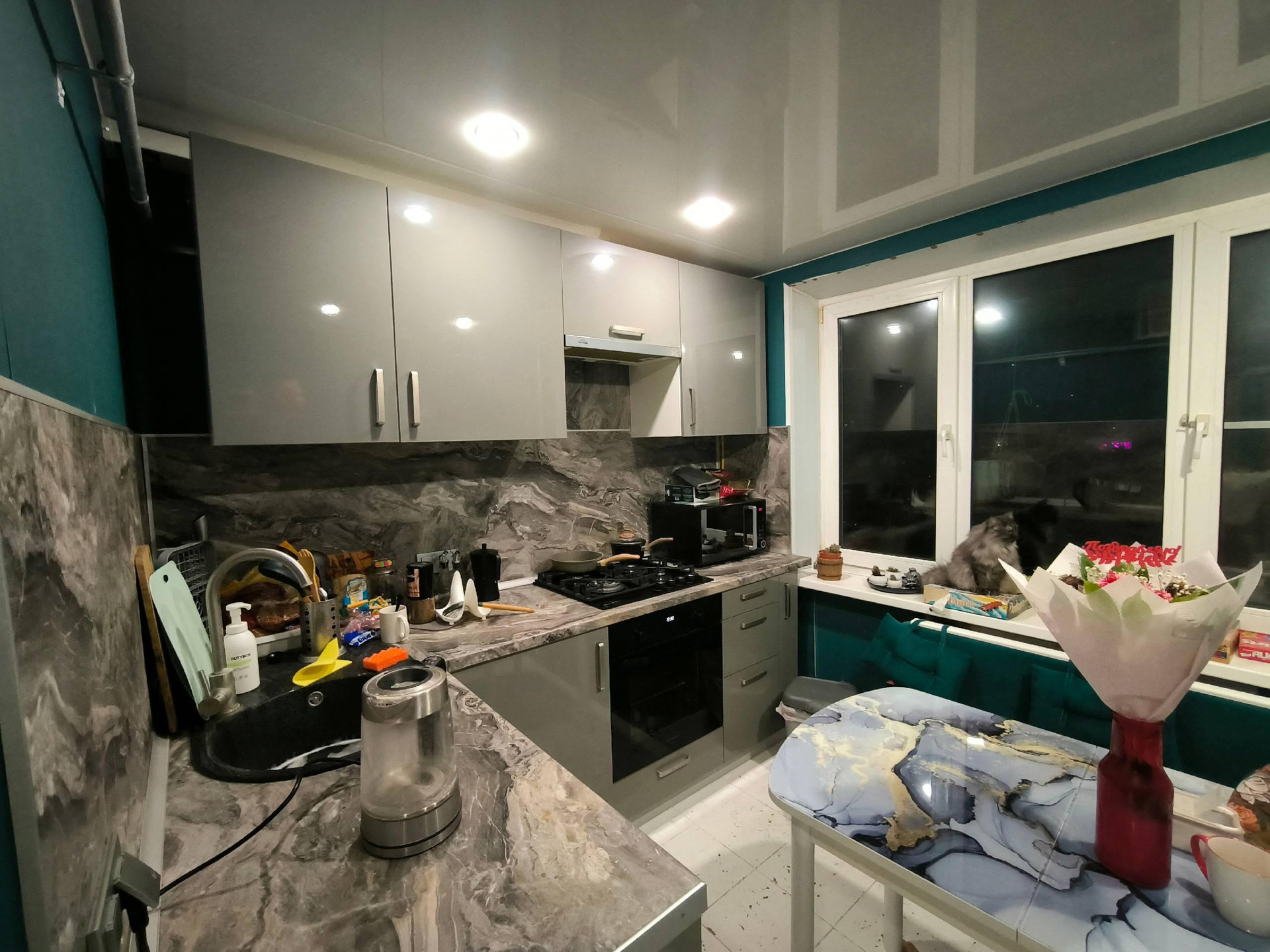В квартире стоят счётчики на воду,газ, электричество,установлены натяжные потолки по всей квартире.