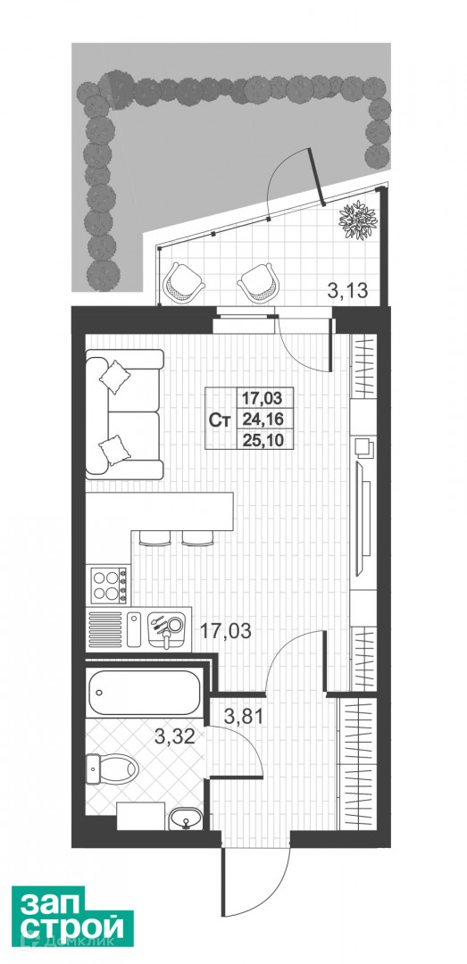 Студия общей площадью 24 м + 3 м балкон + Палисадник,