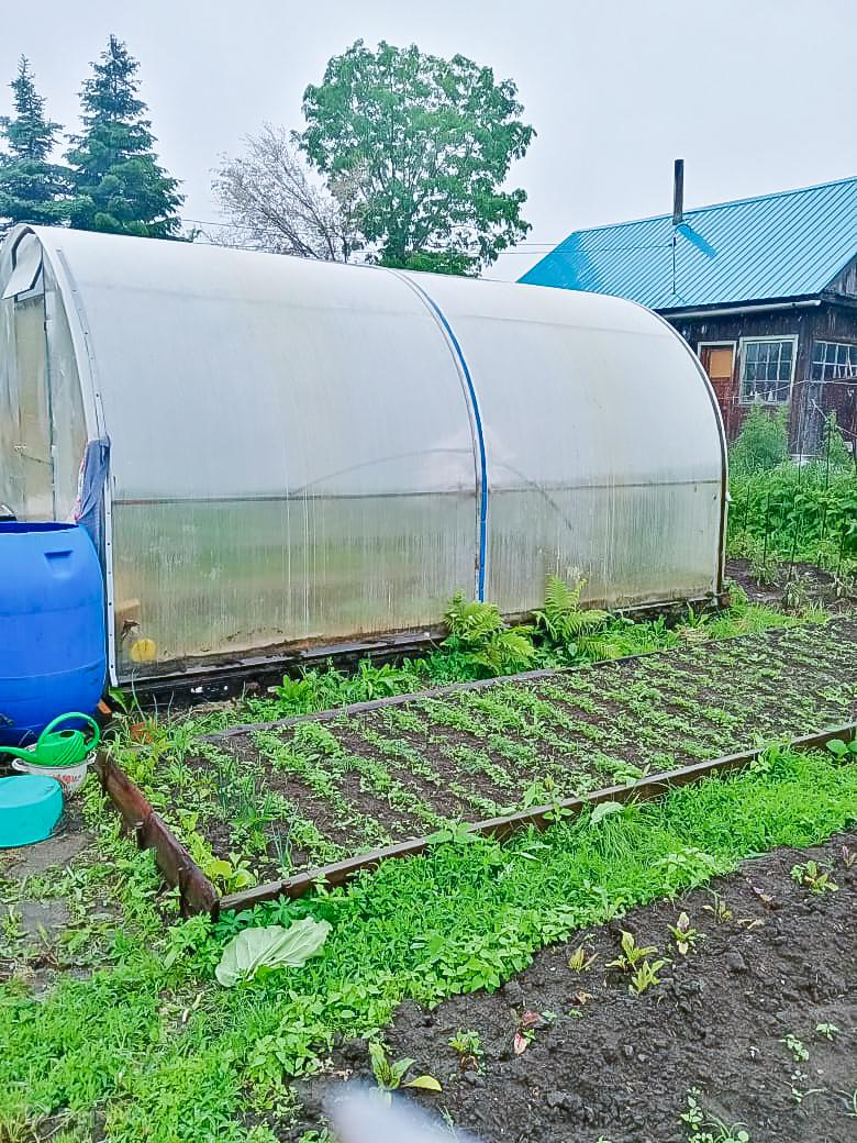 На территории имеются постройки: баня, теплица, металлический гараж (производства г. Хабаровск), ёмкость под воду, есть колодец.