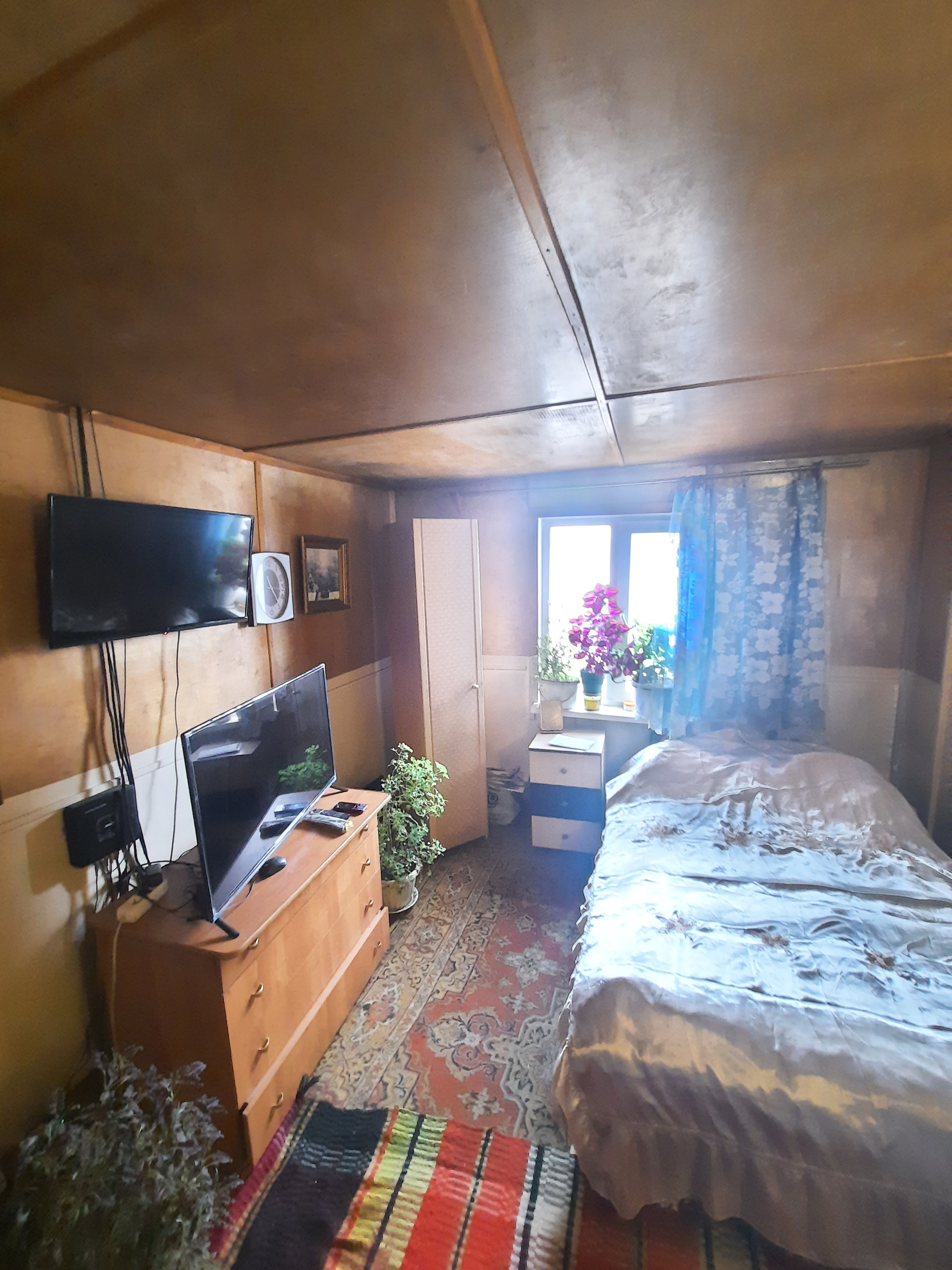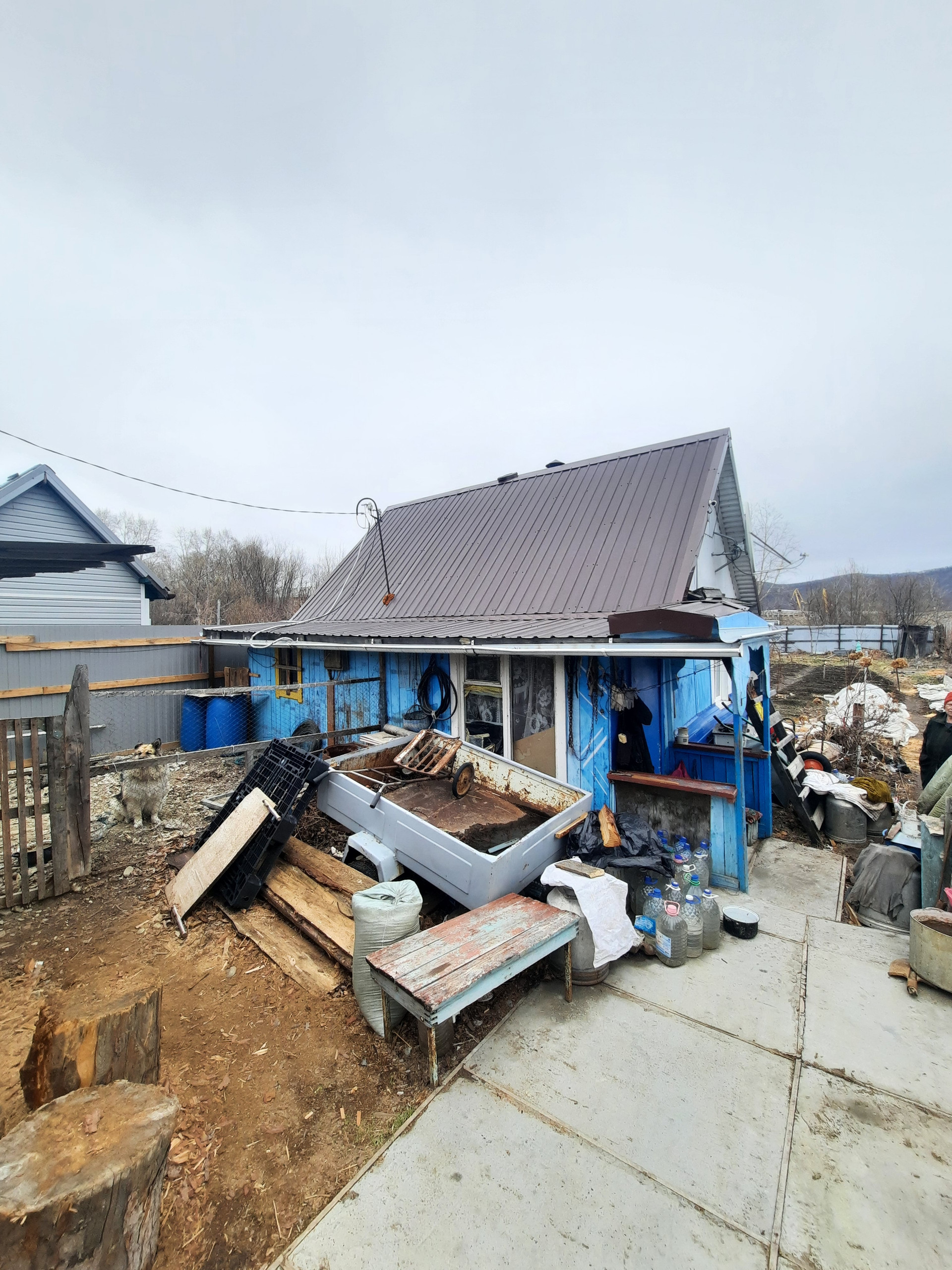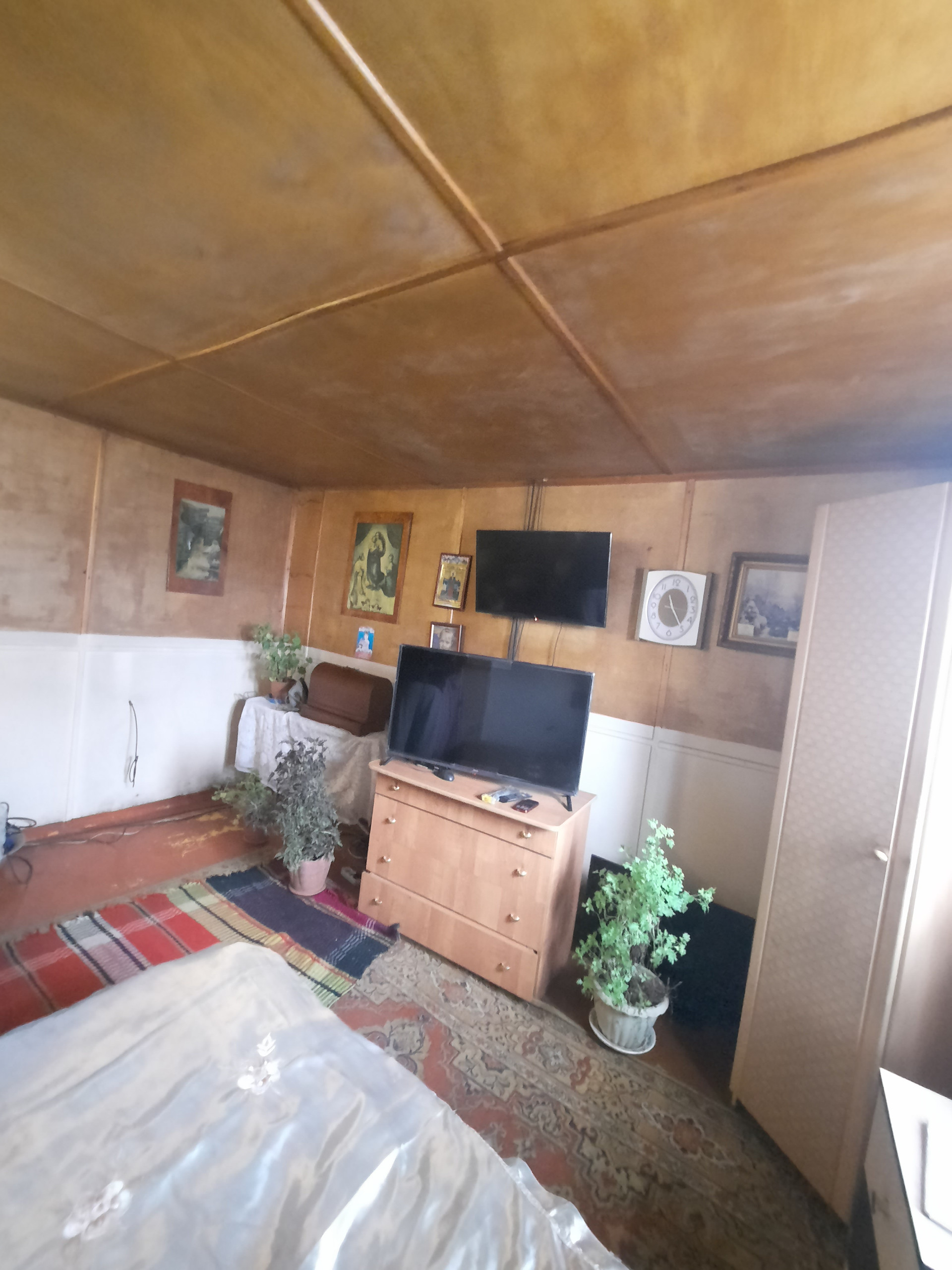Дом щитовой (фанера, утеплитель - пеноплекс). После паводка восстановлен фундамент, произведен ремонт кровли (покрытие - профнастил), установлены пластиковые окна. Дом находится в чистом жилом состоянии.