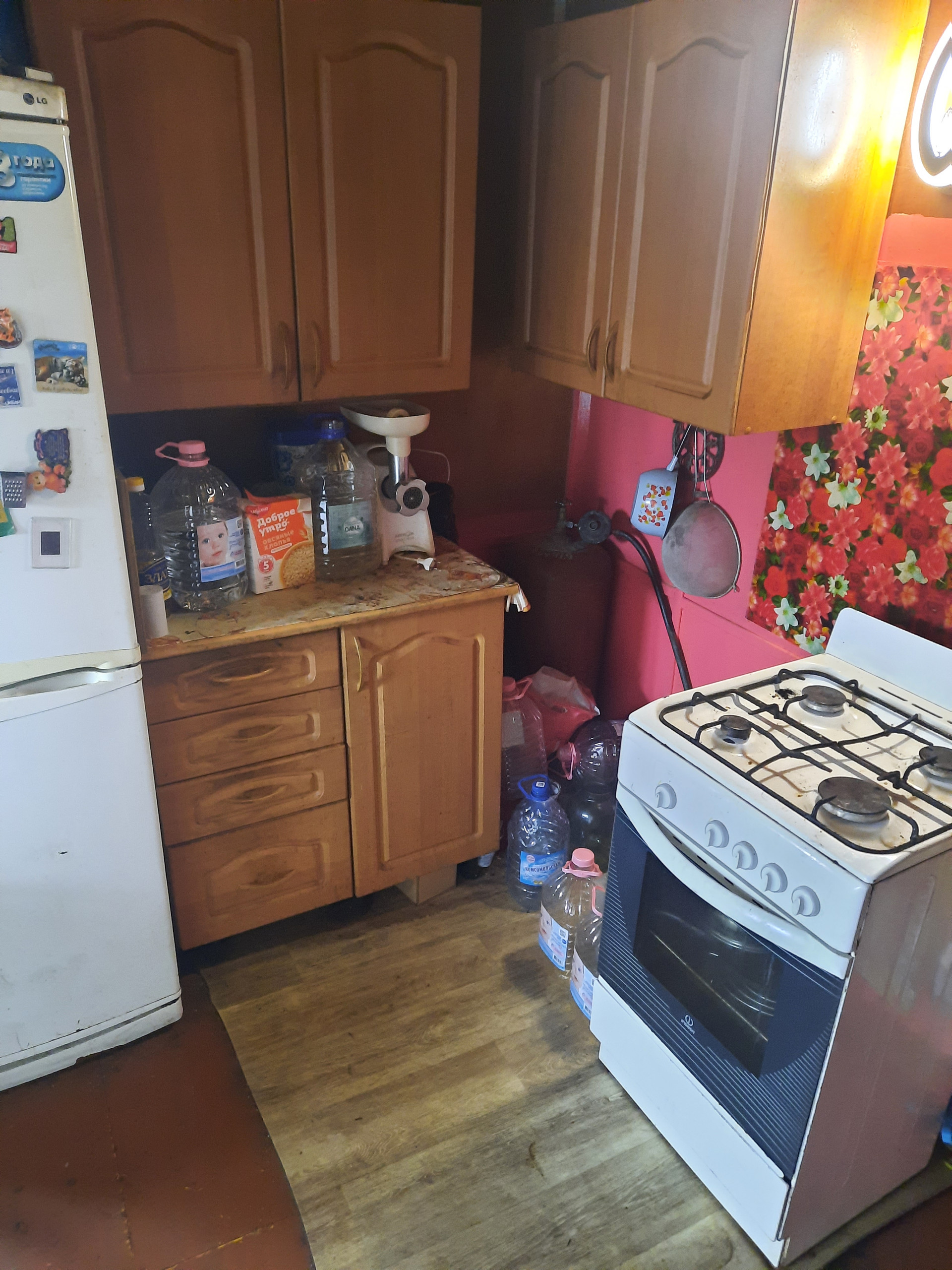 В подарок новым владельцам остаётся: кухонный гарнитур, диван, шкаф, комод, обеденный стол, холодильник.