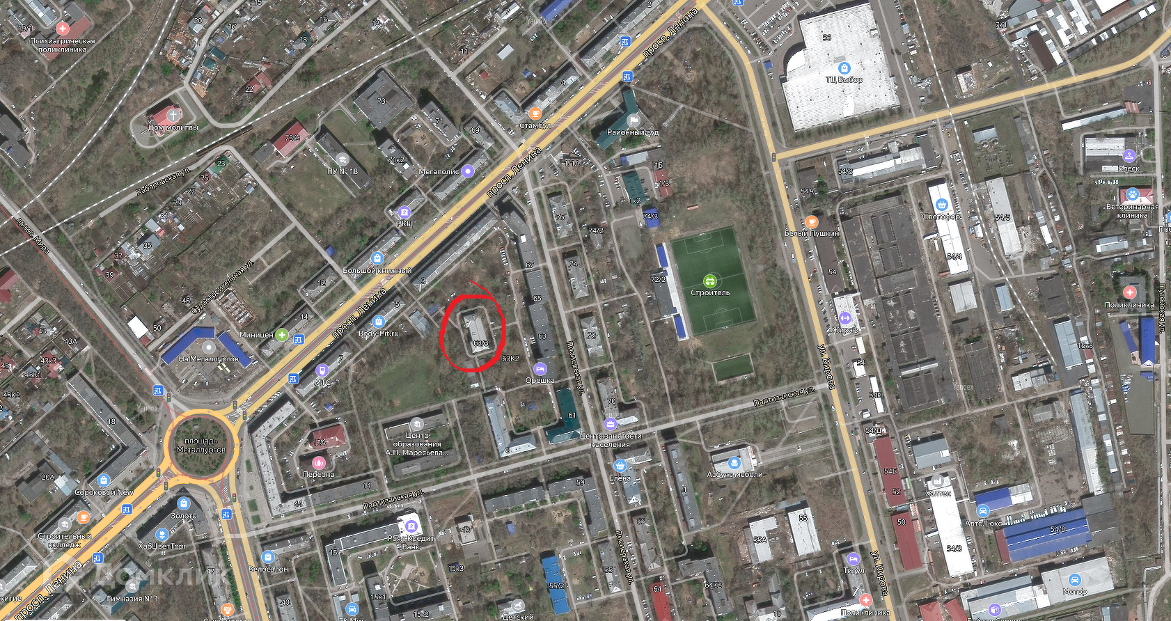 Рядом расположены улицы: Партизанская, Красногвардейская, Краснофлотская, Кирова. Проспект Ленина.