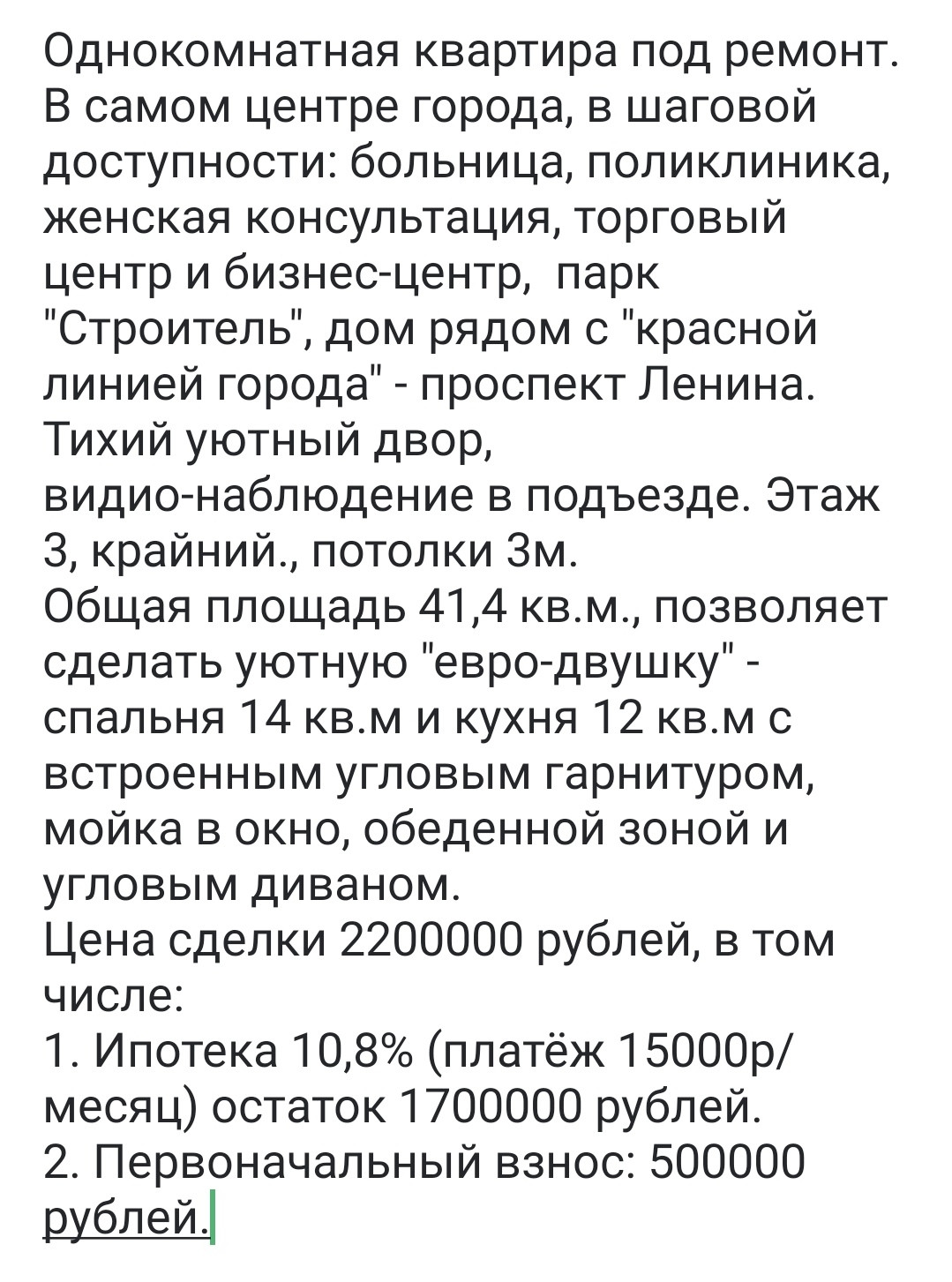 Ипотека 10,8% платёж 15тр + первоначальный взнос 500 тр. Итого 2,2 млн.р.