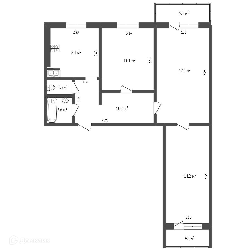 Общая площадь 65.5 м2