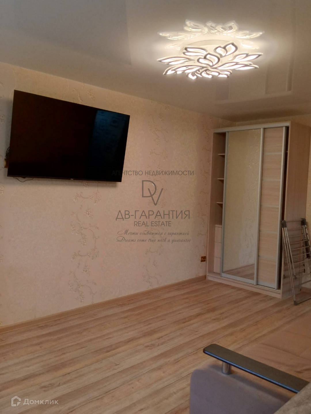 большой телевизор, вместительный шкаф;