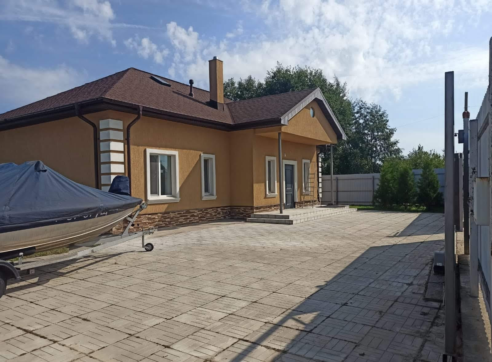 Дом кирпичный , утепленный и отделан декоративной штукатуркой, общеӣ площадью 150 м². На 1-ом этаже прихожая, котельная, гостиная совмещ. с кухней с выходом в сад,  2 санузла( в одном ванна) ,