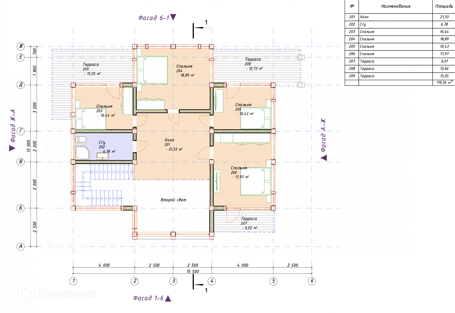2 этаж: холл, второй свет, четыре спальни, с/у