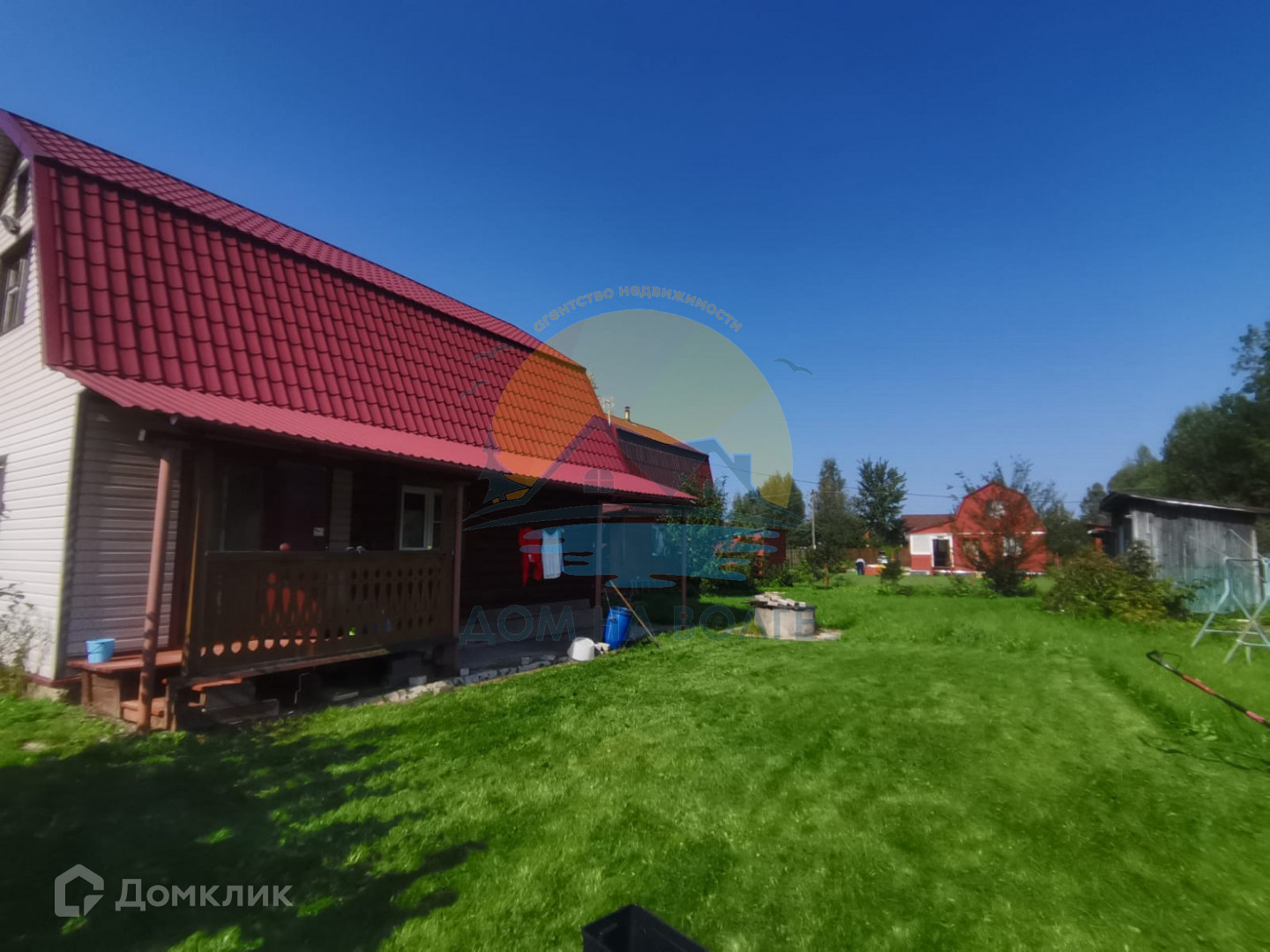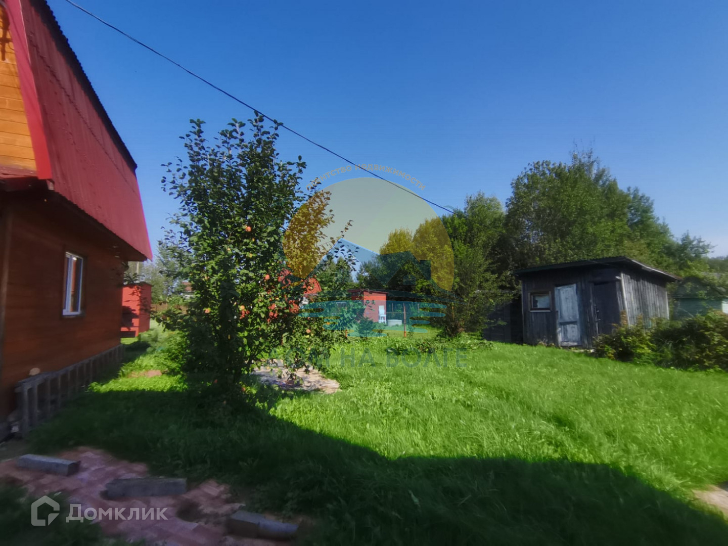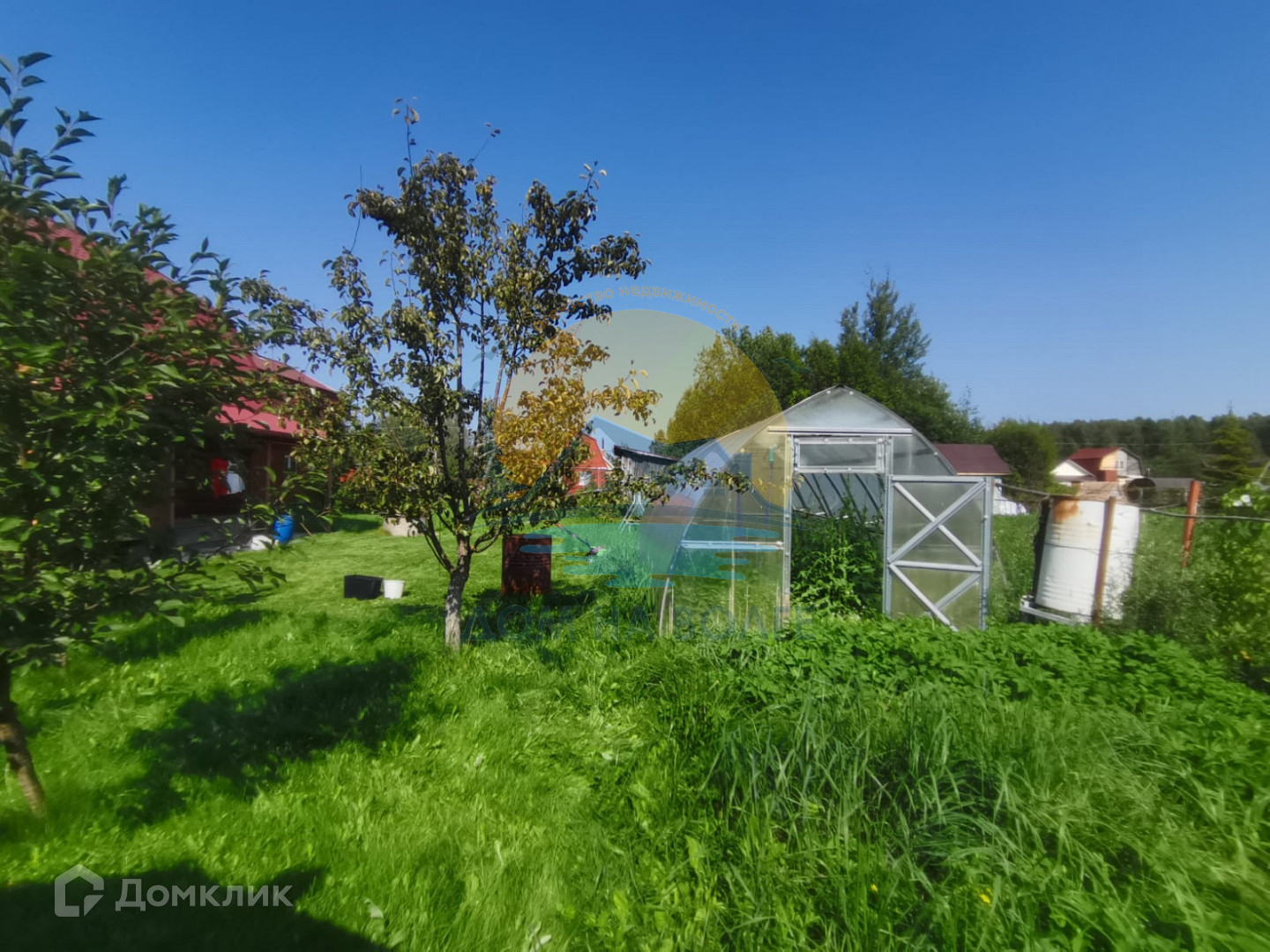На участке растут плодовые деревья (яблони, груши, слива), малина, смородина.