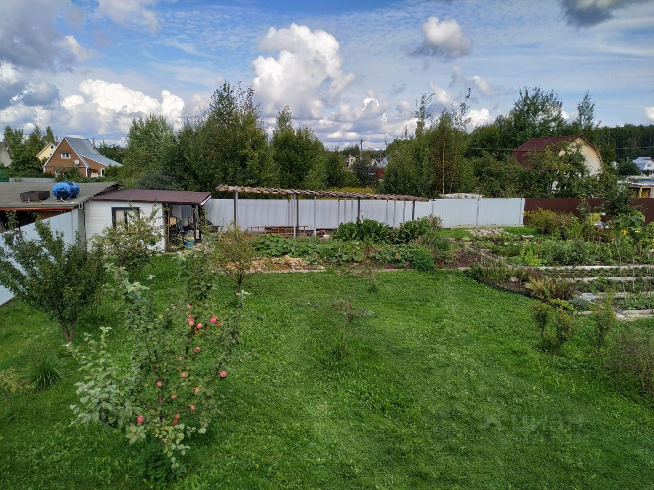 Огород с высокими грядками, кирпичными тропинками и дренажом. Газон и к нему газонокосилка). Из деревьев есть сливы, калина, яблони, груши, виноград, вишни, можжевельник. Кустарники: смородина - 4 вида, малина, актинидия, войлочная вишня. На грядках растет все что можно посадить. Из цветов и трав очень много всего лекарственного. Огромная(25 м2) поляна нарцисов. Все ухожено, прекрасно растет и отличныи урожаи. Много сортовых растений. И сельхоз. инвентарь в придачу).