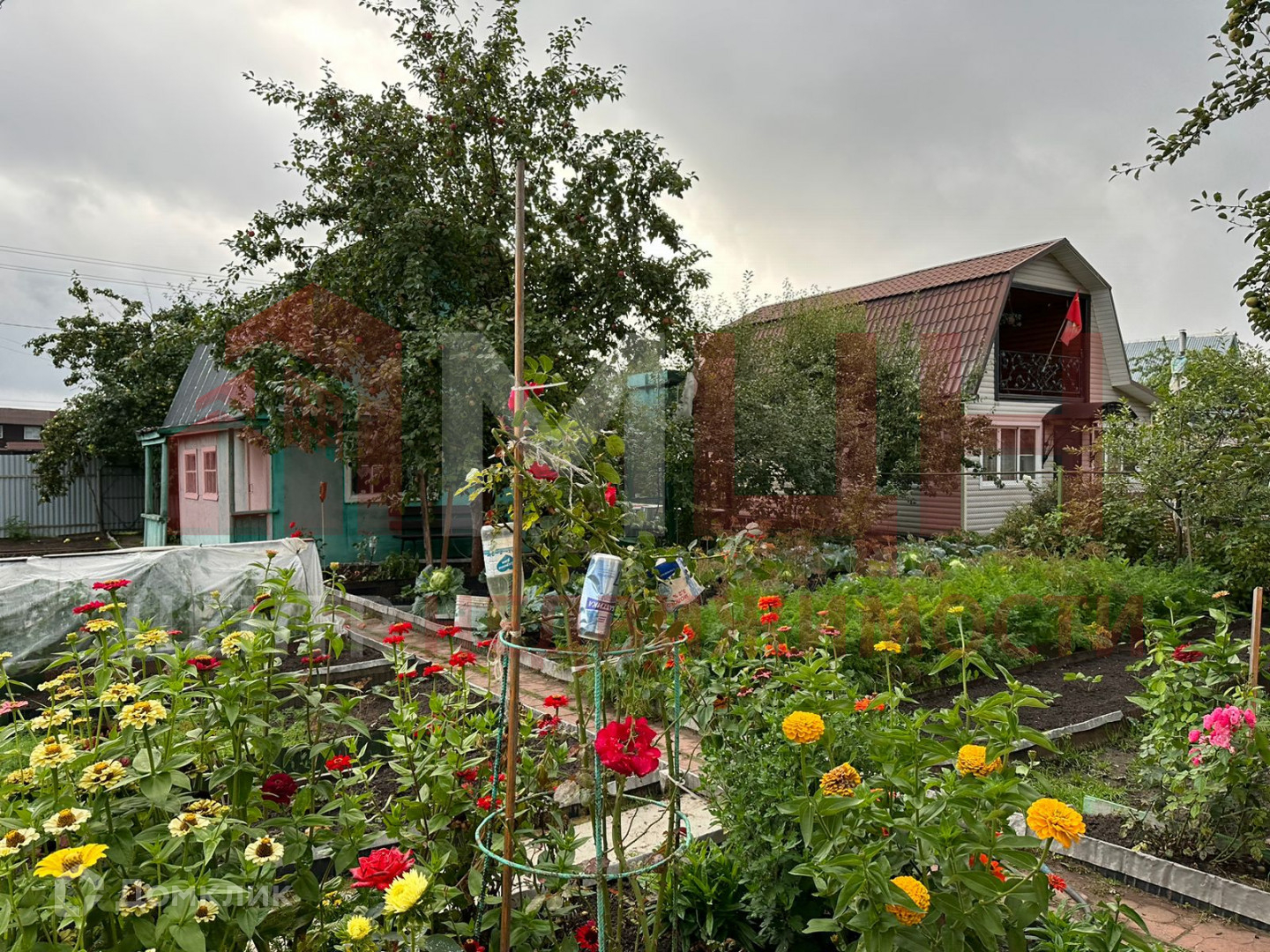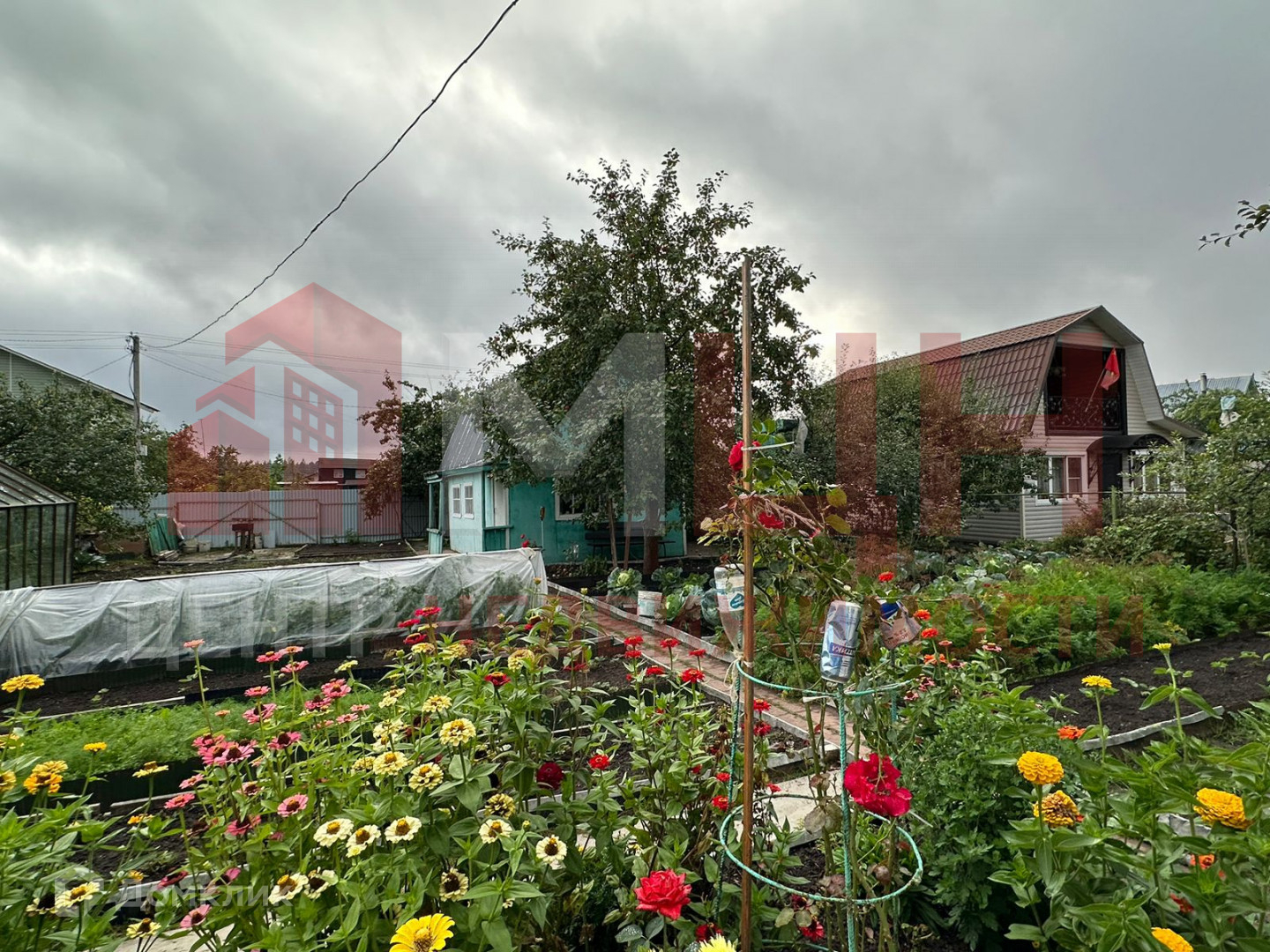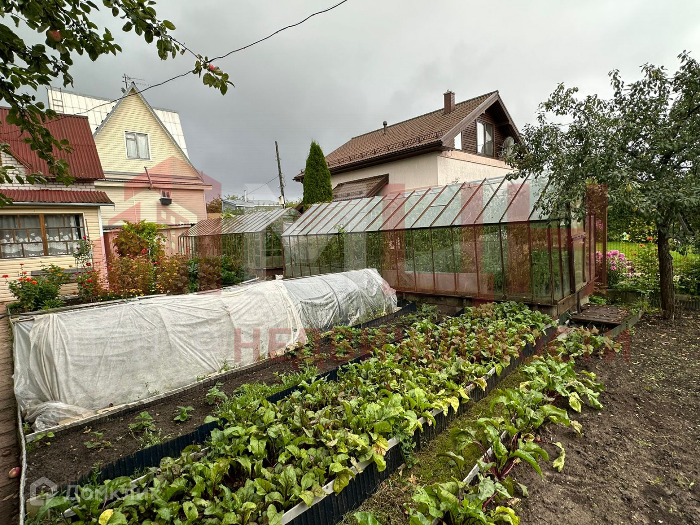 Есть плодово-ягодные деревья и кустарники, грядки, две теплицы, сарай.