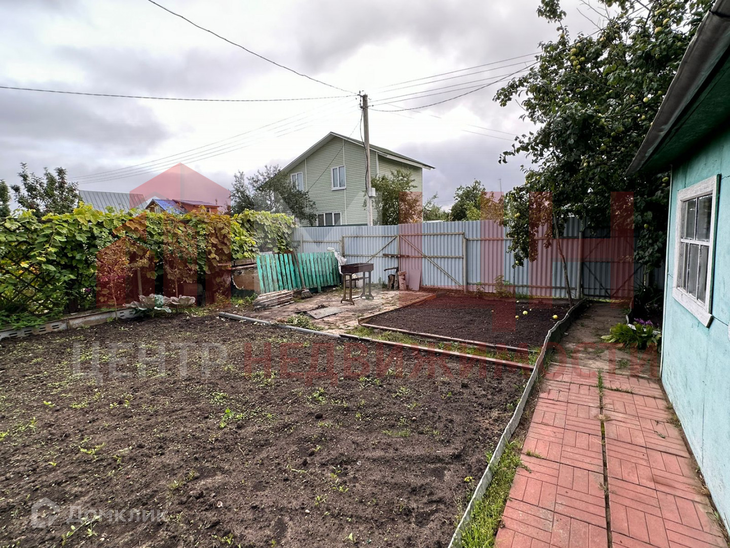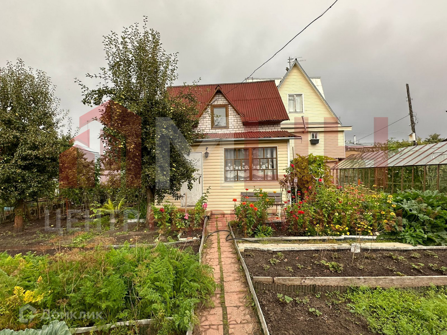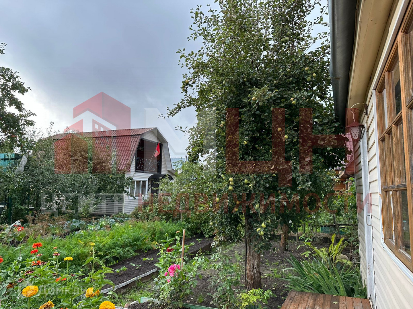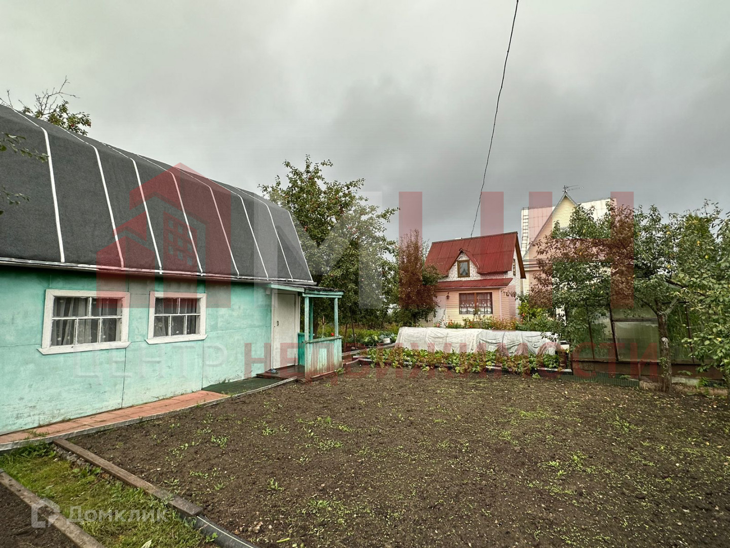 Есть плодово-ягодные деревья и кустарники, грядки, две теплицы, сарай.