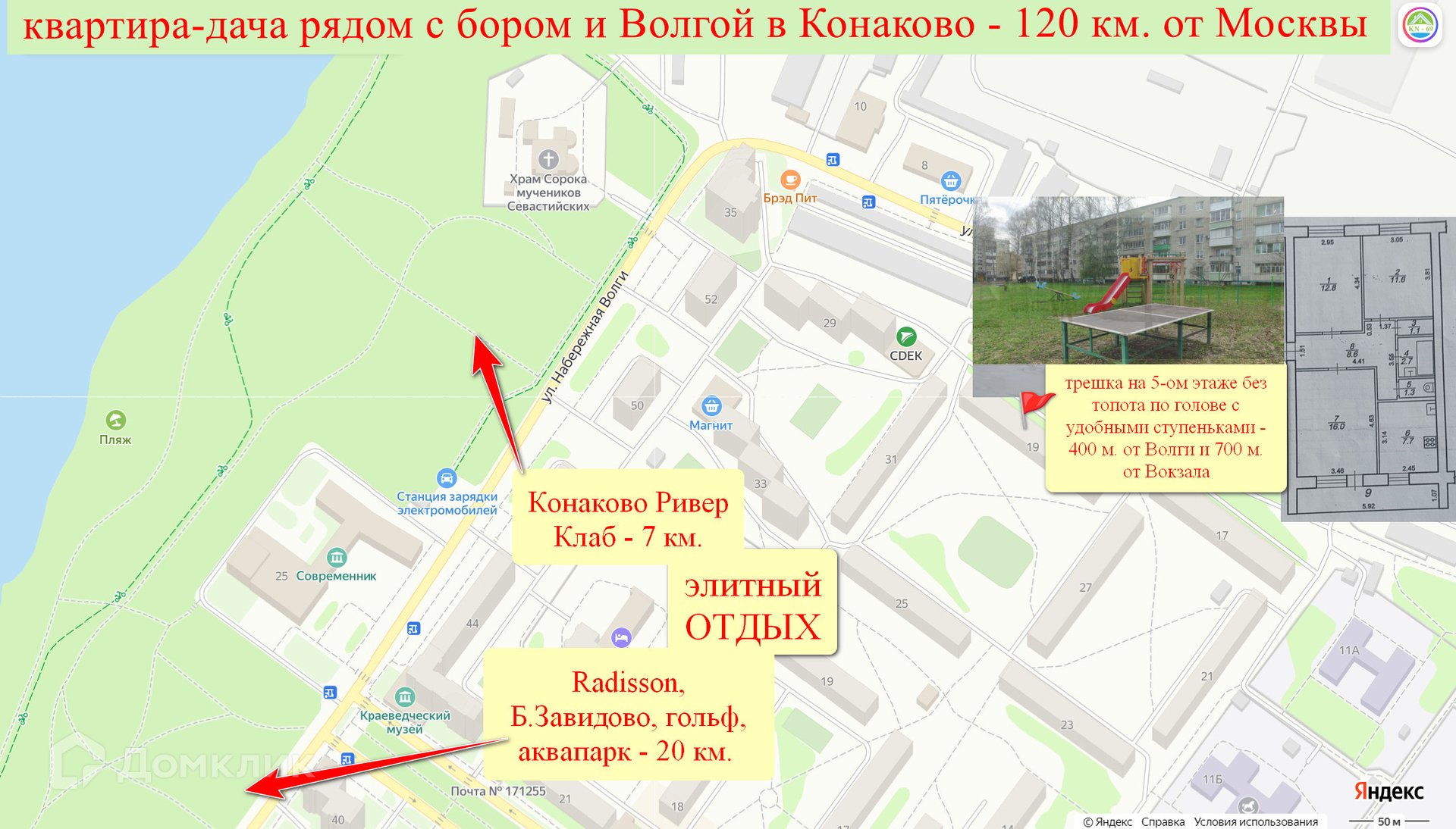 Транспортная доступность: Вокзал с Ласточками до Москвы находится в 700 метрах. Легко добраться до известных мест отдыха, таких как Ривер клаб, Рэдиссон, Большое Завидово и дипкорпус, как на собственном, так и на общественном транспорте.