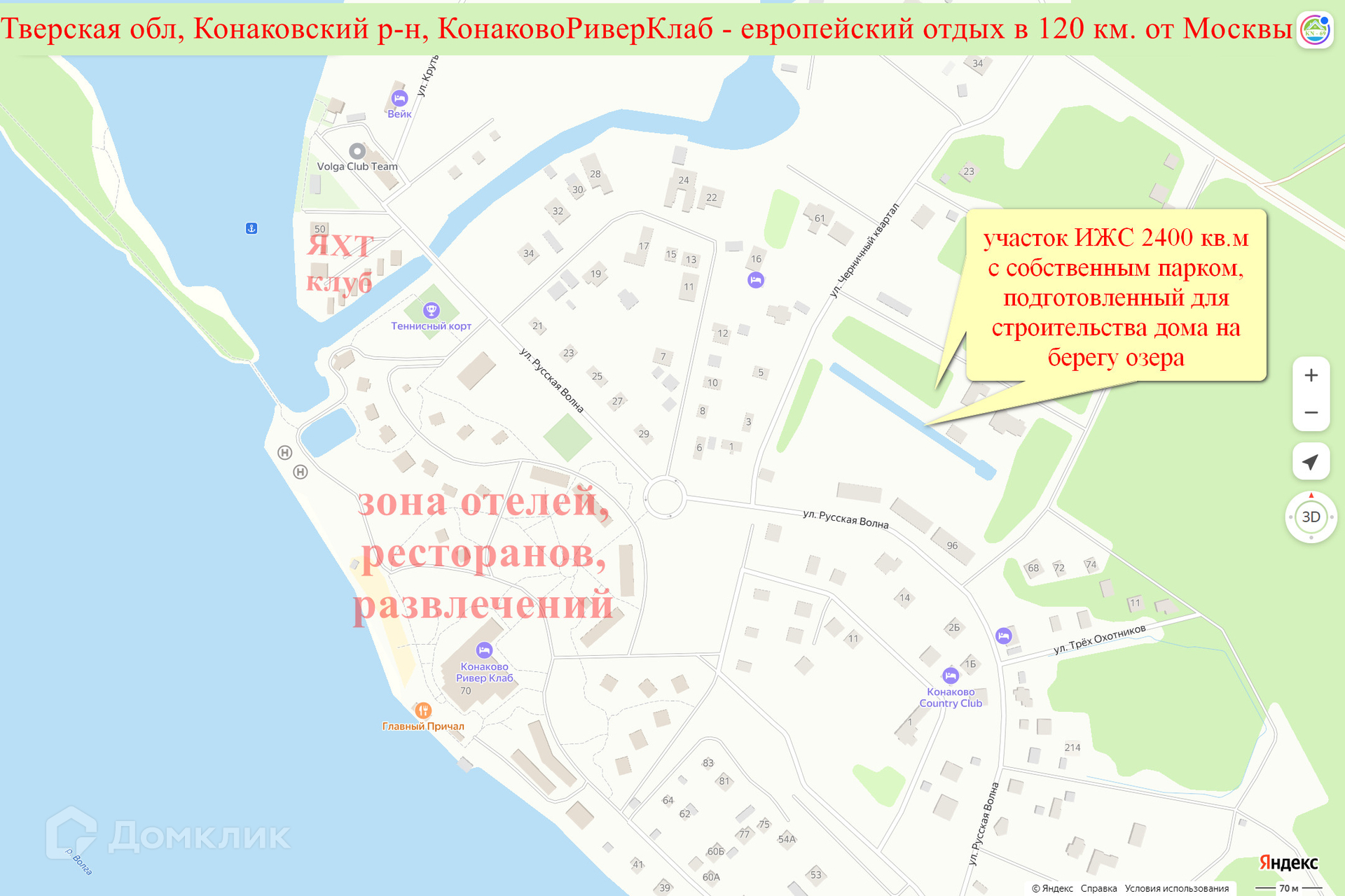 Эксклюзивное предложение! Участок 2400 кв.м со своей парковой зоной в центре элитного поселка на берегу Волги - тишина и уют домашнего очага и неограниченные возможности для любого вида досуга на земле или воде. КонаковоРиверКлаб - уникальная концепция и Европейский уровень сервиса и комфорта. Закрытая территория - чужие здесь не ходят, мероприятие каждую неделю для гостей Event-Отеля и владельцев домовладений поселка, современный яхт-клуб с причалом для яхт длиной до 20 м, а также аренда спортивного оборудования и многое другое.