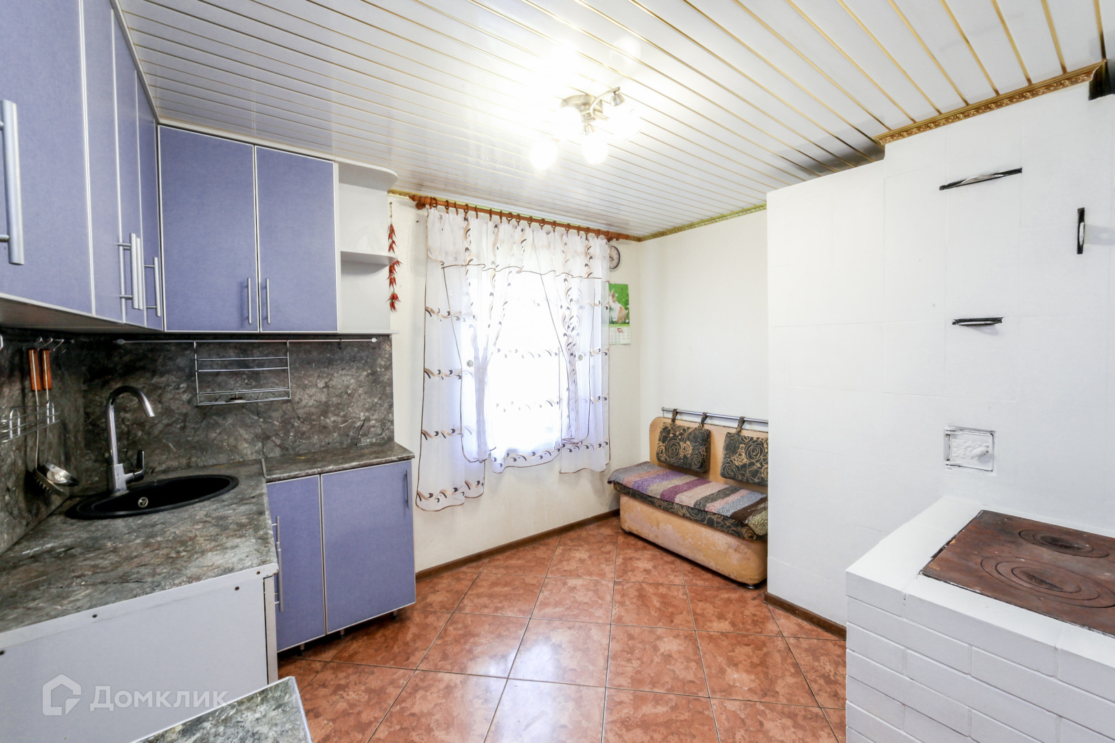 Светлая кухня с печкой, на полу плитка, кухонный гарнитур остаётся.