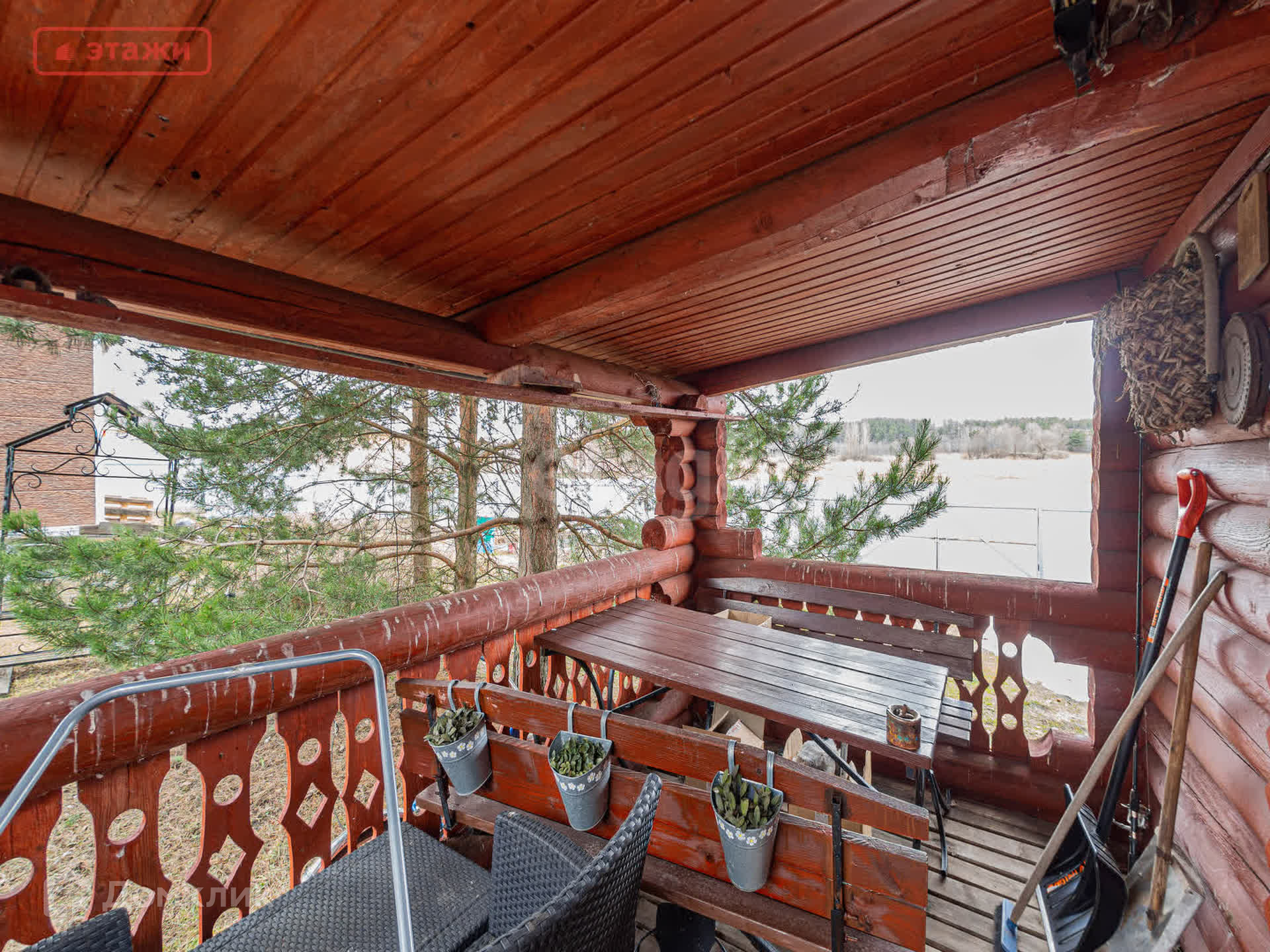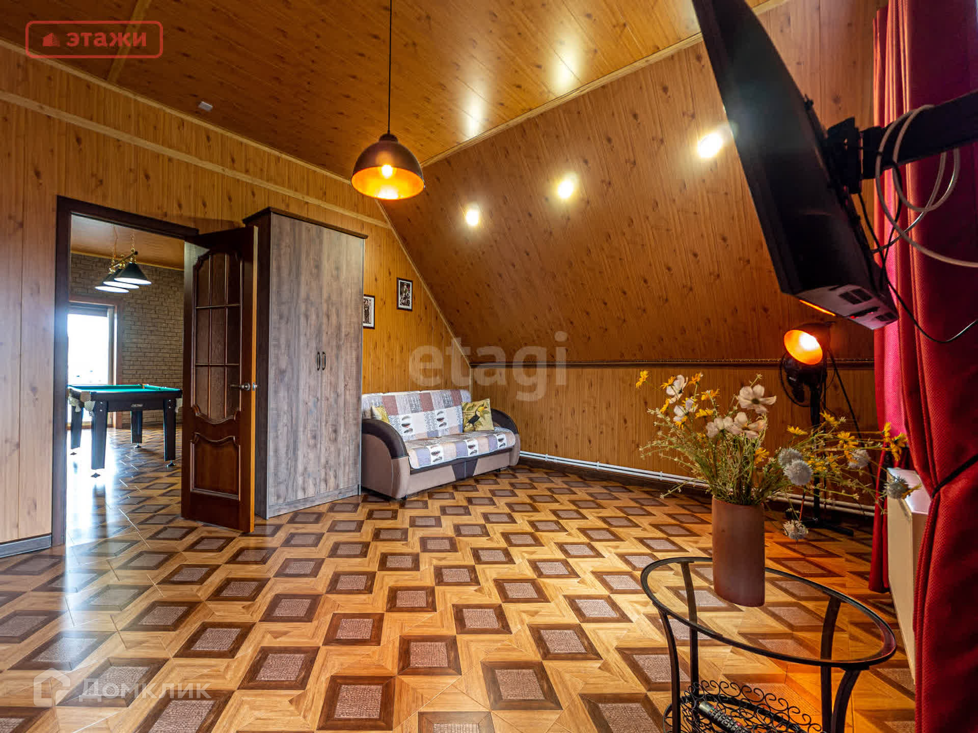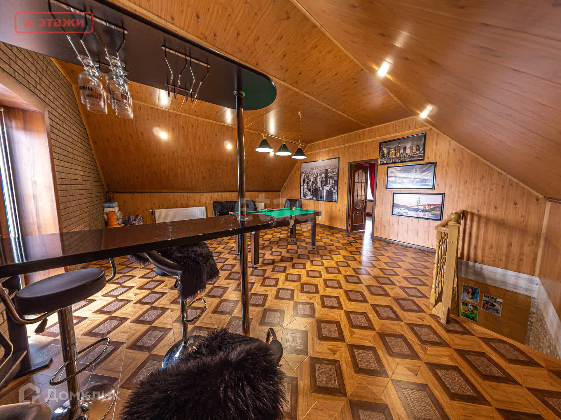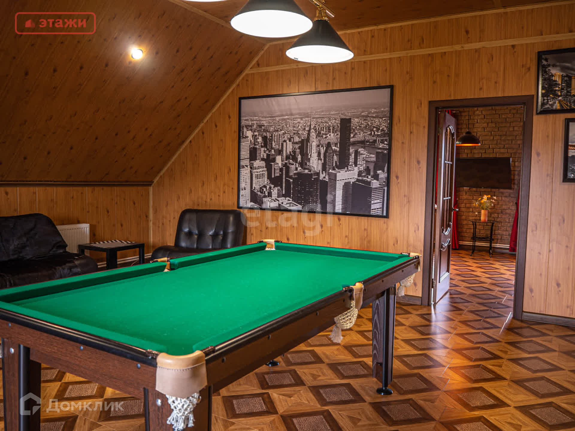 На первом этаже находится просторная гостиная с панорамными окнами и камином, уютная спальня, вместительная гардеробная, раздельный сан.узел. Лестница из массива ведет на второй этаж в стильную бильярдную и гостевую комнату. Имеется вся необходимая бытовая техника и мебель, которая остается новым владельцам.