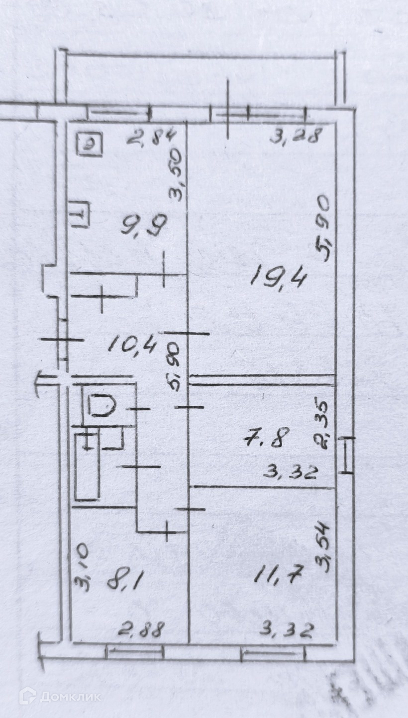 Кухня - 9,9 м2, три спальни - 11,7, 7,8 и 8,1 м2, просторная гостинaя - 19,4 м2